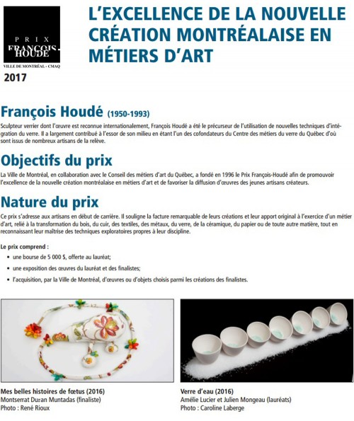 Créé en 1996, le Prix François-Houdé est décerné chaque année par la Ville de Montréal, en collaboration avec le Conseil des métiers d’art du Québec, dans le but de récompenser et de promouvoir le travail d’artisans de la relève qui œuvrent en métiers d’art contemporain sur l’île de Montréal. Il souligne la facture remarquable de leurs créations et leur apport original à l’exercice d’un métier d’art relié à la transformation d’une matière, tout en reconnaissant leur maîtrise des techniques exploratoires propres à leur discipline.