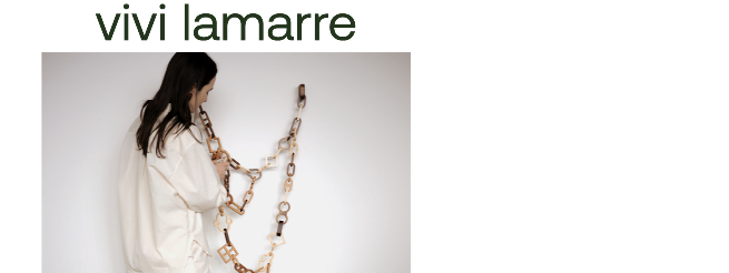 Montréal, 12 avril 2023 - Reconnue pour ses bijoux en bois et cuir, Vivi Lamarre lance une nouvelle gamme de pièces toujours plus sculpturales. La designer et artiste bijoutière, anciennement connue sous le nom Louve Montréal, propose une nouvelle série de pièces d’expression. À la frontière entre le bijou et l’œuvre murale, ces chaînes sont destinées à être portées en tant que colliers ou encore à être exposées au mur en tant qu’objet de design. D’ailleurs, elles sont conçues avec un socle mural qui offre à la fois un dispositif de présentation adapté et une méthode de conservation du bijou lorsqu’il n’est pas porté.