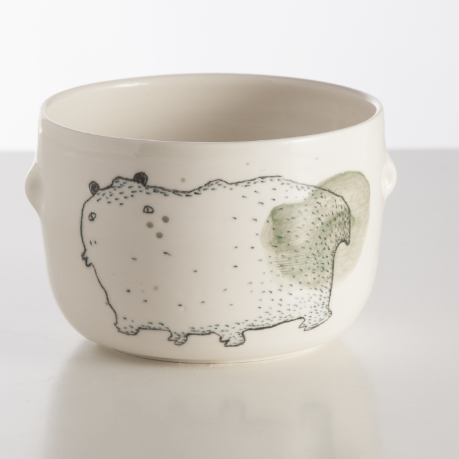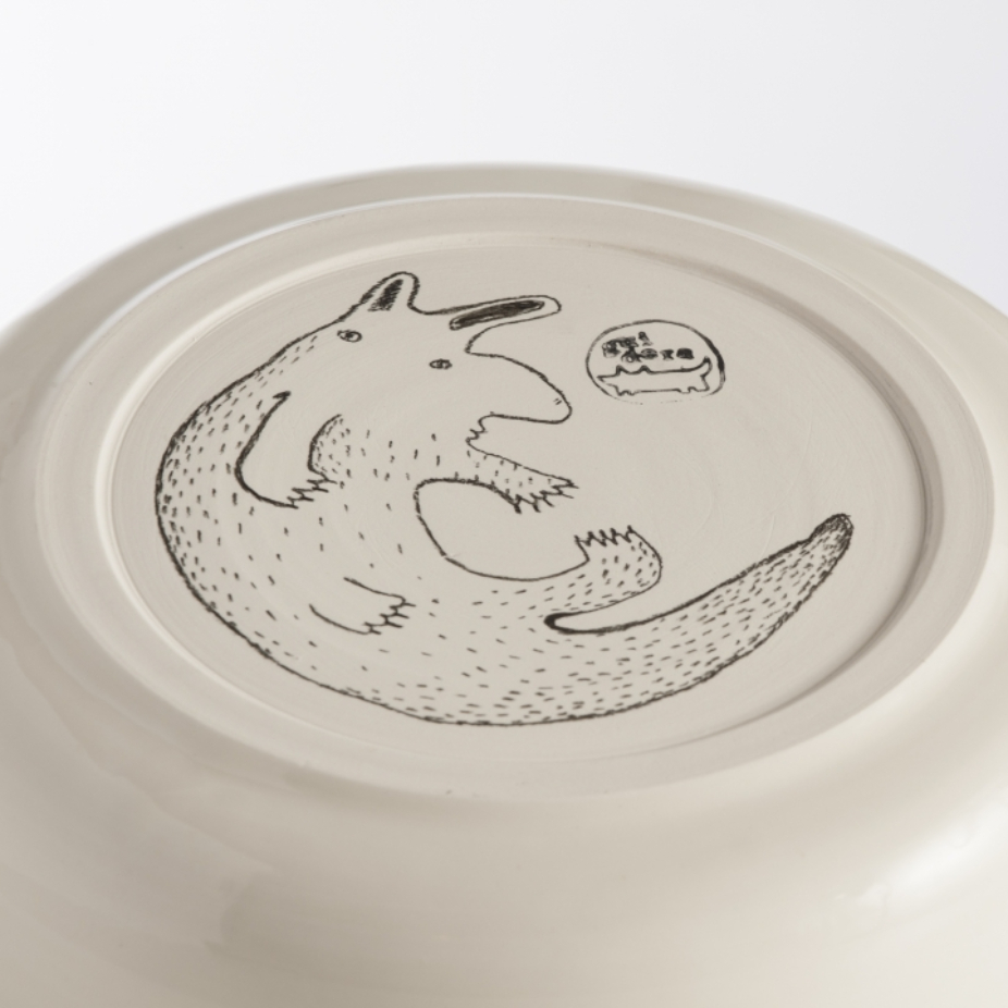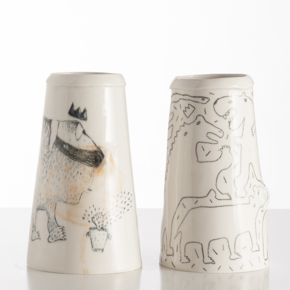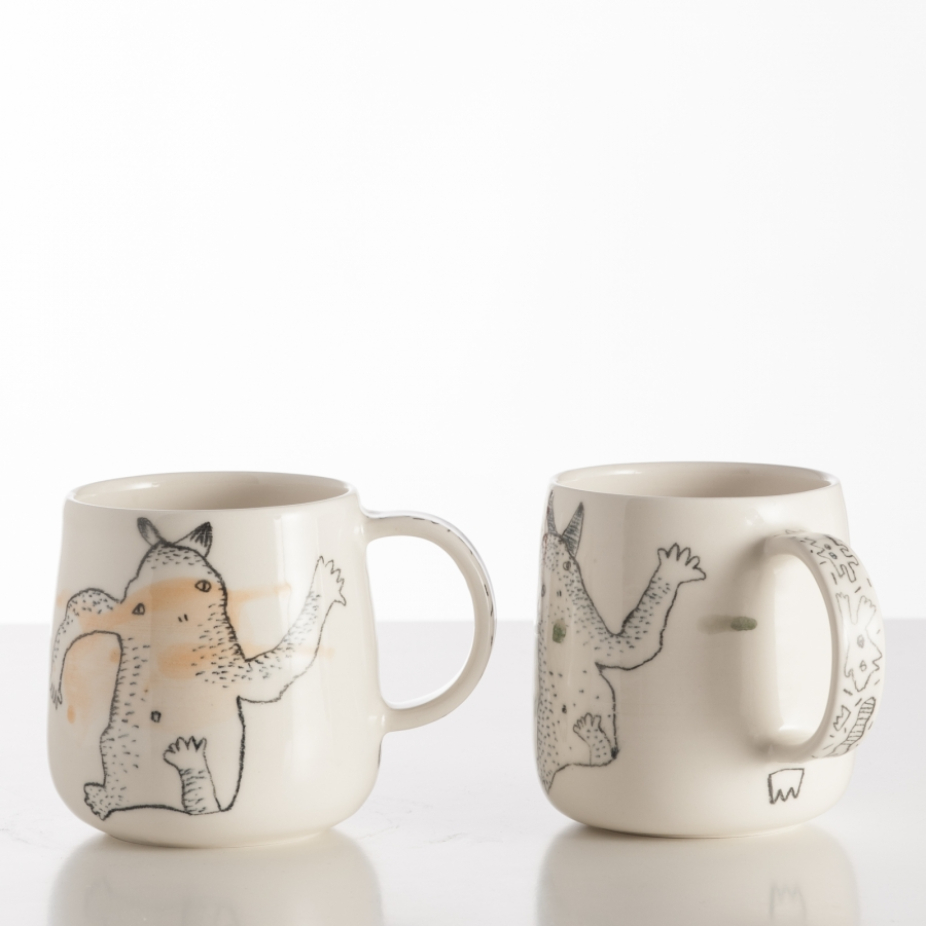 Le travail en céramique de Paul Guidera évoque de façon générale la naïveté et la spontanéité. Par un trait qu’on pourrait juger enfantin, Paul dessine partout et sans cesse des monstres – mais de gentils monstres ! Au gré de son imagination et des histoires, l’artiste rajoute chaque jour des créatures à son bestiaire imaginaire. Paul s’inscrit donc dans un rapport illustratif de la céramique mais ses pièces sont aussi conçues pour être utilisées au quotidien. Humbles, parlantes et ludiques, Pauline souhaite qu’elles touchent autant les adultes que les enfants.