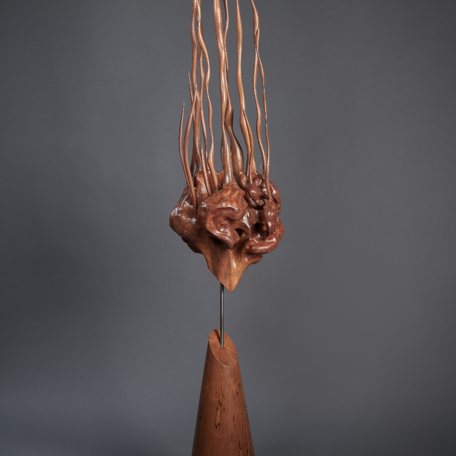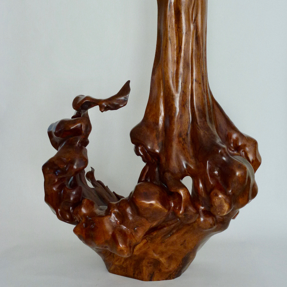Native de l’Ancienne-Lorette et issue d’une famille de douze enfants, Christianne Hamel a élu son domicile fixe à Beauport en 2015. Elle navigue dans les arts depuis sa tendre enfance. Lors d’un cours à l’atelier St-Elme, elle a été conquise par le verre et l’a œuvré avec passion durant une vingtaine d’années. Elle a réalisé quelques expositions qui lui ont permis d’être évaluer par ses pairs et devenir membre du Conseil des métiers d’art du Québec. Pour augmenter son champ de possible, en 2016, elle effectue un retour aux études en sculpture à la Maison des métiers d’art de Québec. Parmi les matières étudiées, c’est le bois qui l’a davantage séduite. À l’exposition des finissants de 2019, ses pièces uniques l’ont fait lauréate de quatre prix. Dans son atelier, ce sont les techniques de tournage, de cintrage et de taille directe qu’elle a exploitées. Lorsque la pandémie est survenue, faute de bois manufacturé, elle a dû se réinventer avec les ressources qu’elle avait sous la main. Elle a alors découvert les broussins (ou les loupes). Les arbres possédant ces excroissances sont déclassés et rejetés par les scieries. En sculptant ces mal-aimés, elle leur redonne vie.