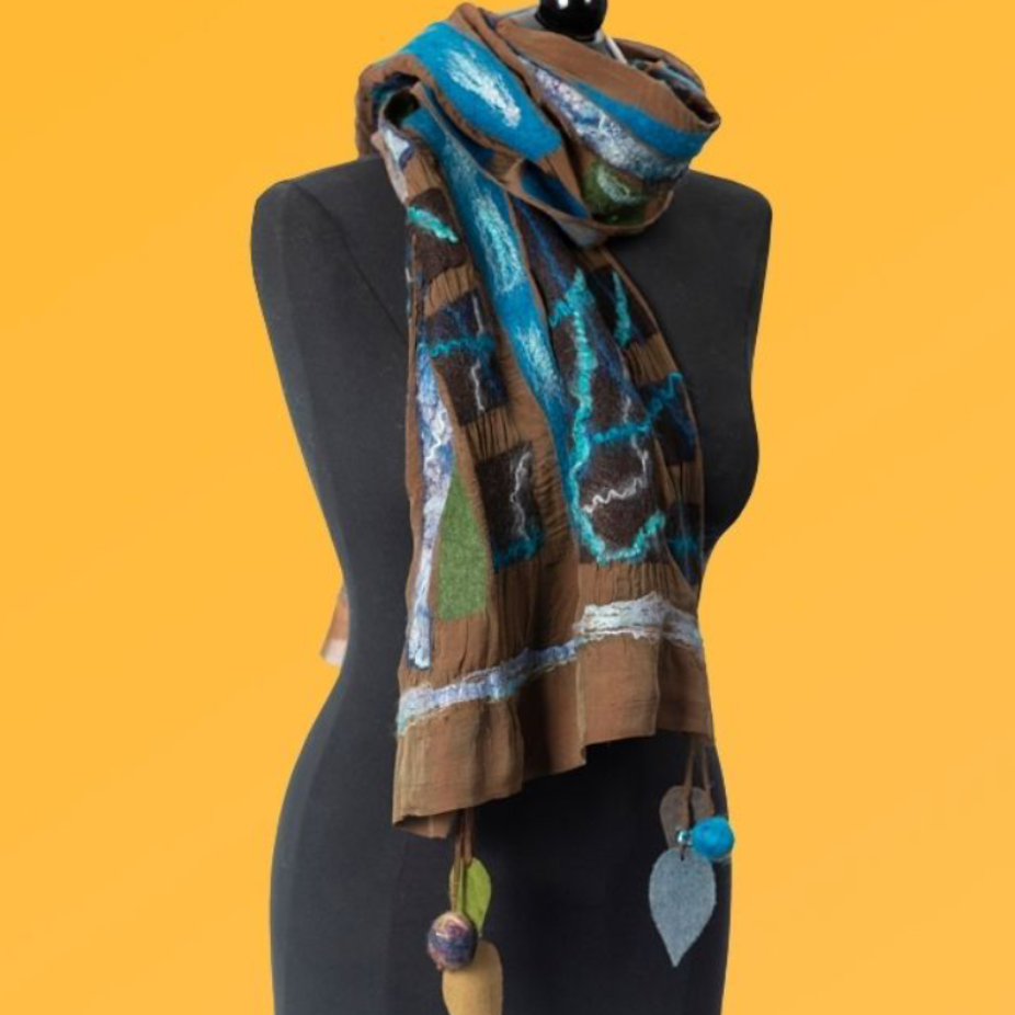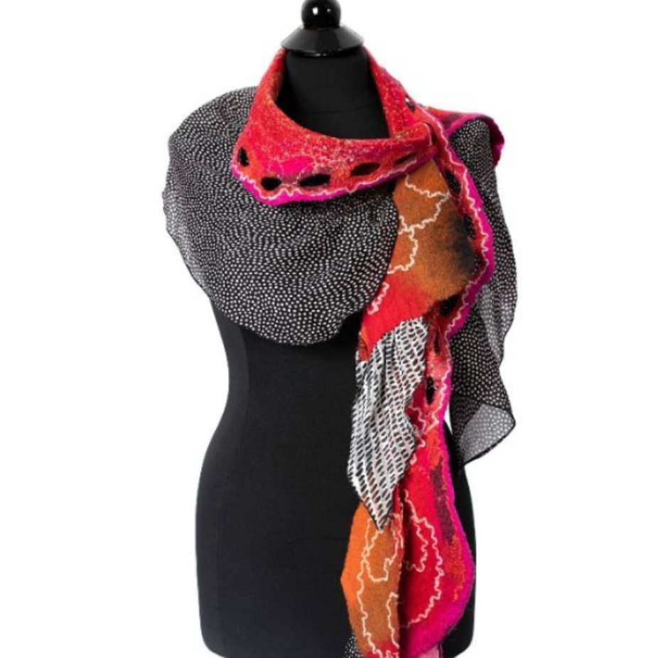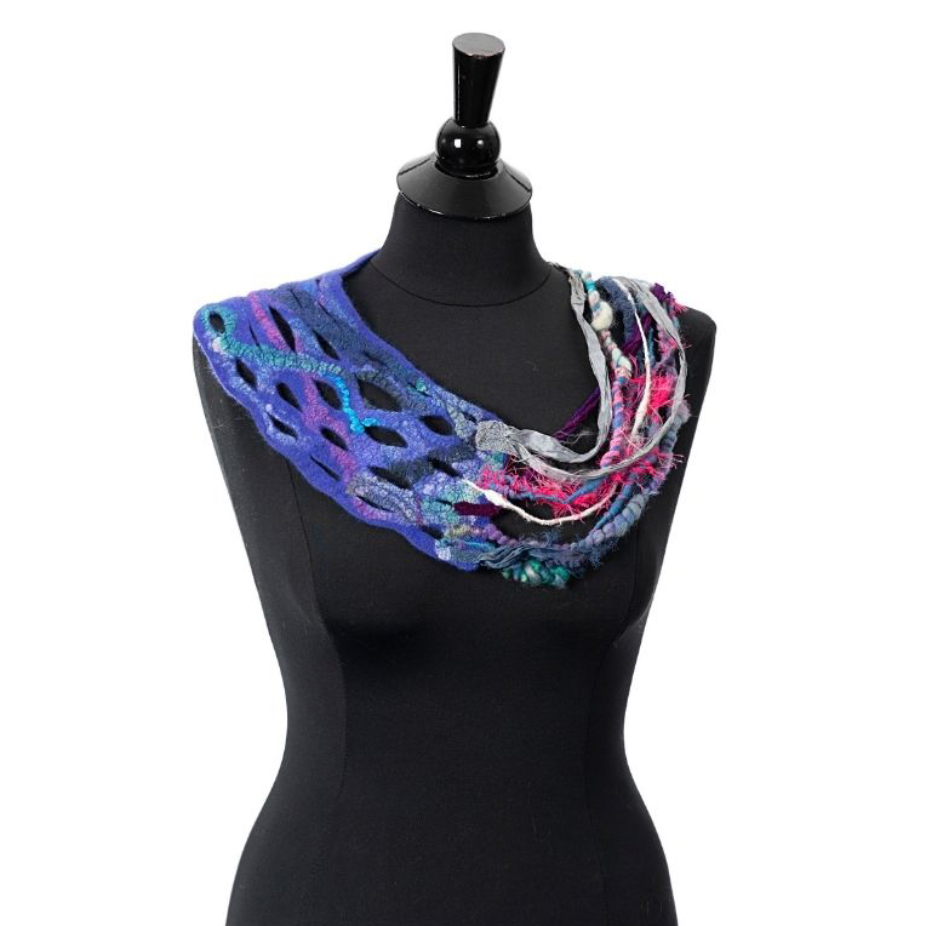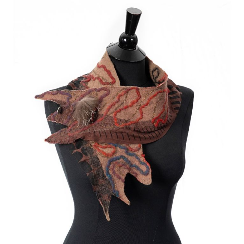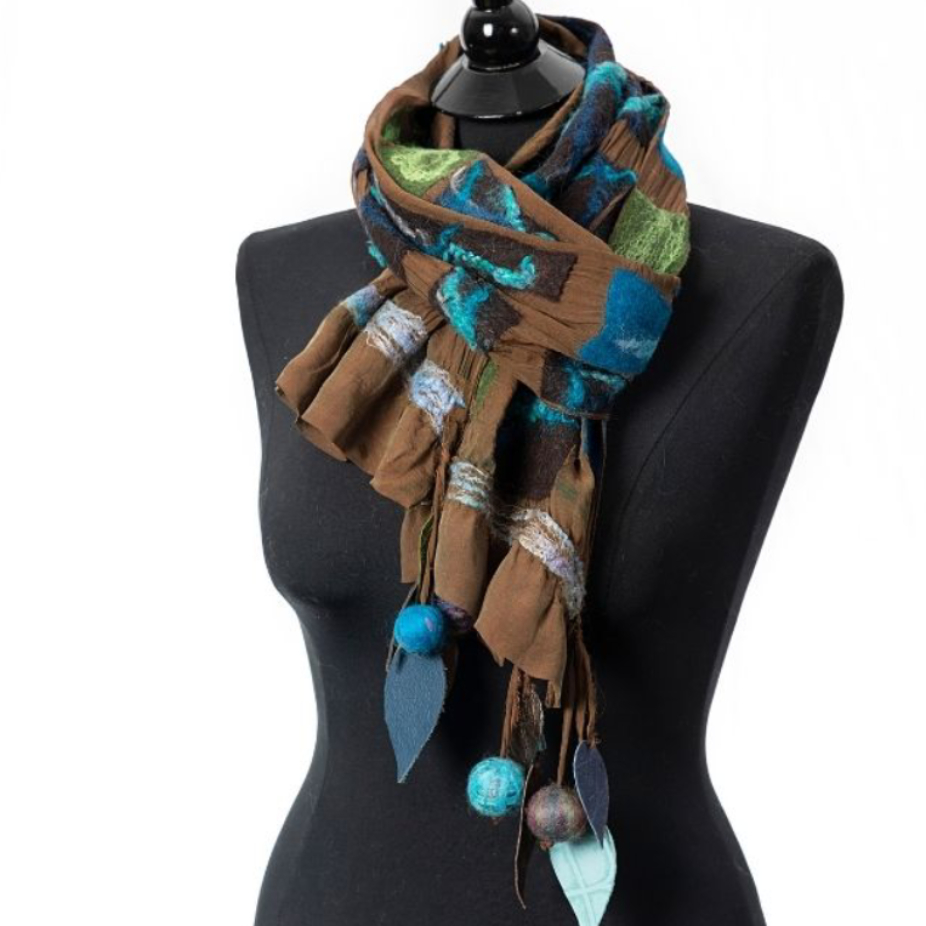 Accessoires en laine de Mérinos et soie, réalisés en exemplaire unique et petite série par des techniques de feutrage Nuno, à plat, 3D, à l’aiguille et de couture : foulards, plastrons, cols, châles, sacs, etc
