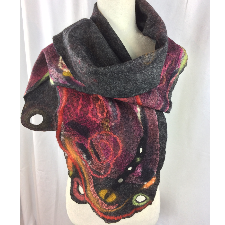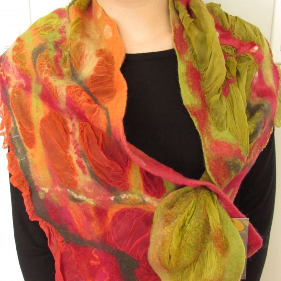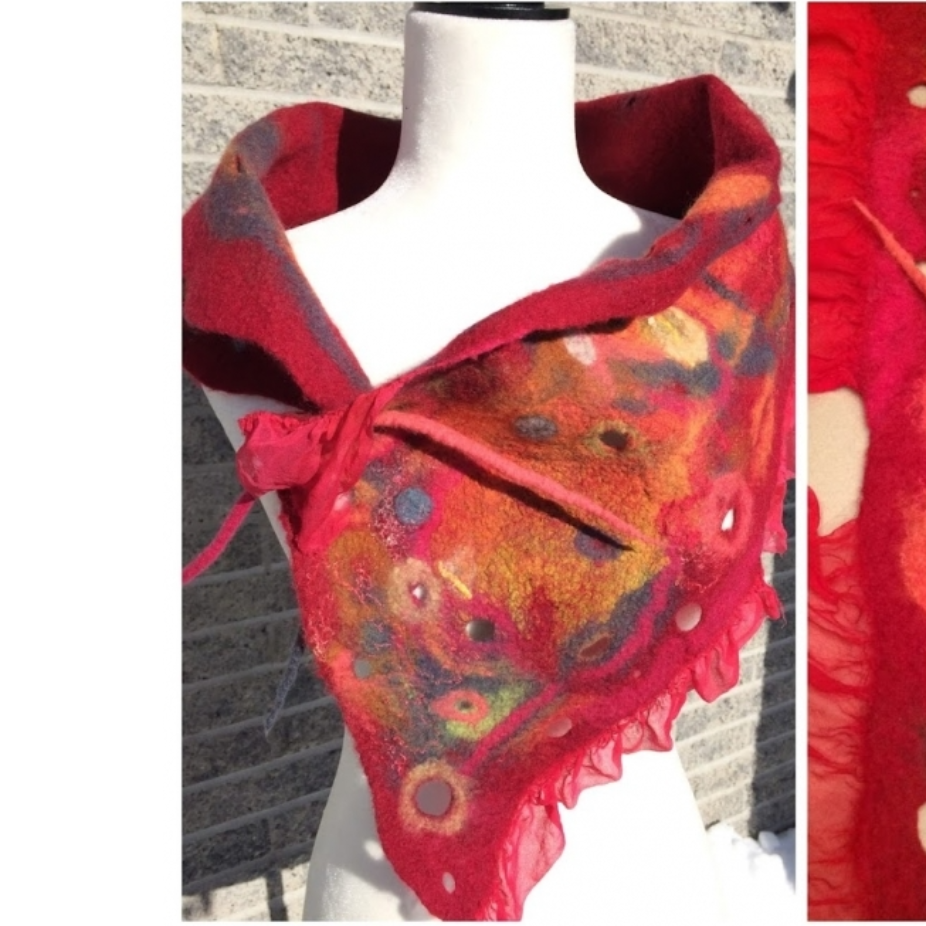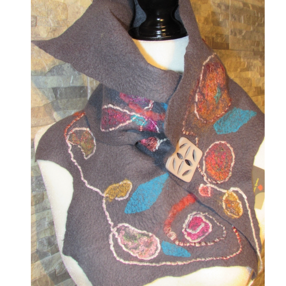 Dès l’adolescence, je me suis découvert une passion et une curiosité pour l’art et la création. J’ai tout d’abord choisi de m’exprimer par la peinture à l’huile par l’entremise de cours au début mais rapidement, j’ai débuté mes propres créations. Les couleurs, les fleurs m’attirent particulièrement et j’adore l’expression nette et précise de cet art. Ma rencontre avec le feutre est une révélation dès le départ. Ce médium me permet de m’exprimer comme avec la peinture mais avec moins de restriction totalement libre de mon inspiration du moment. Les couleurs vibrantes se croisent au gré de mon humeur mais aussi des matériaux qui me tombent sous la main; la soie, les fibres, les bouts de laine….. Je couche mes idées directement sur la fibre, sans croquis ni dessin. Tout au cours de la manipulation de la fibre, la création suit son chemin, créant une œuvre textile d’exception d’un design unique. Passionnée, je crée pour m’évader. Le feutre sait m’enflammer à chaque création et je demeure toujours soucieuse de sa qualité. Cette technique millénaire, je la fais mienne avec une touche contemporaine, colorée et d’élégante.