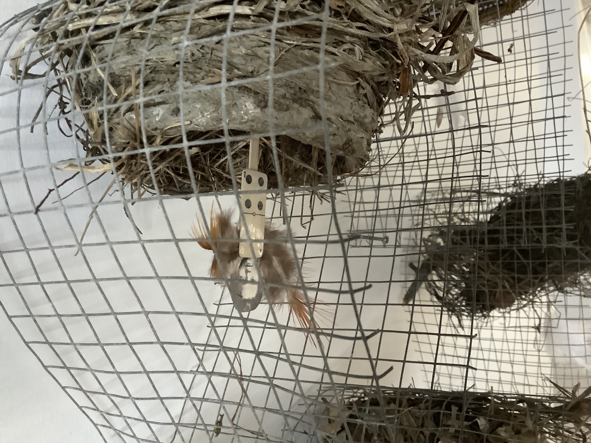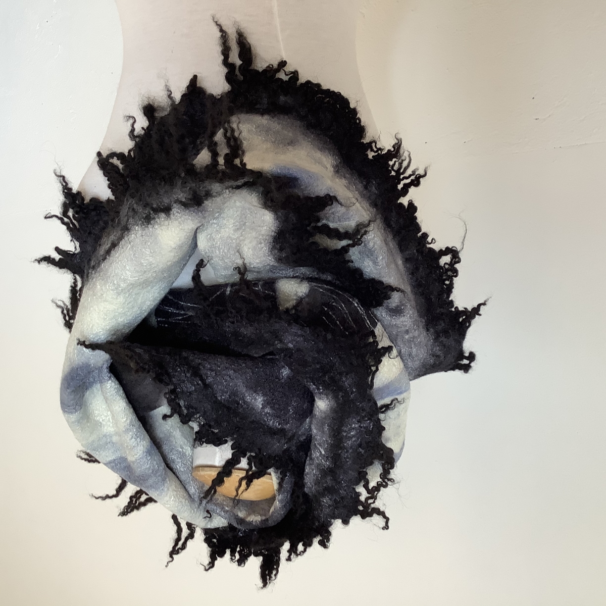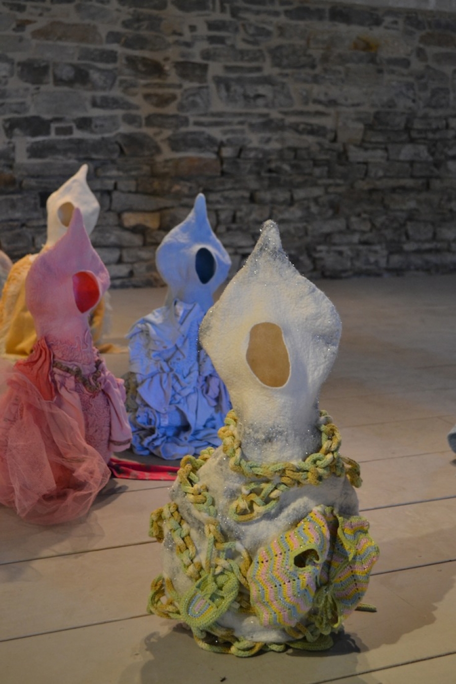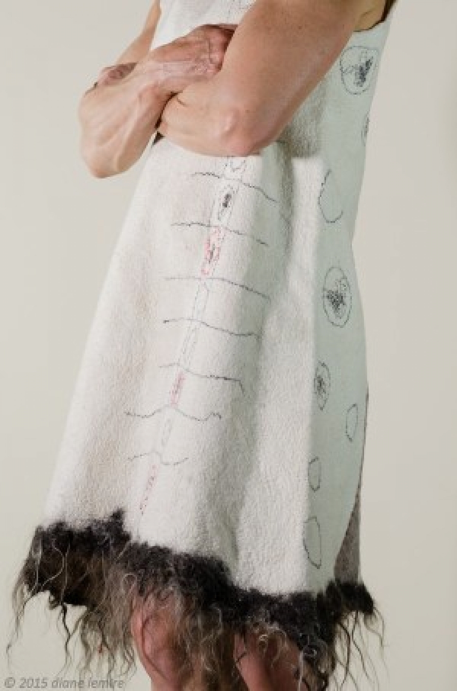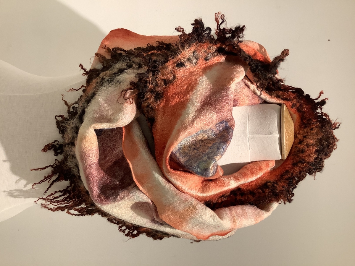 Sculptures, vêtements et accessoires, oeuvres uniques principalement en feutre auquel l’artiste intègre une variété d’objets: des poupées, des perles, du verre, des os, de la poterie, de l’argent, des dés à coudre, des pièces d’outils et des vêtements vintage. L’histoire de ces matériaux recyclés reflète son héritage.