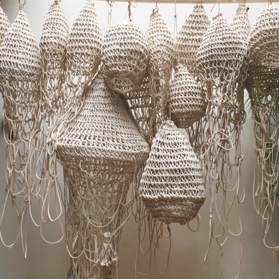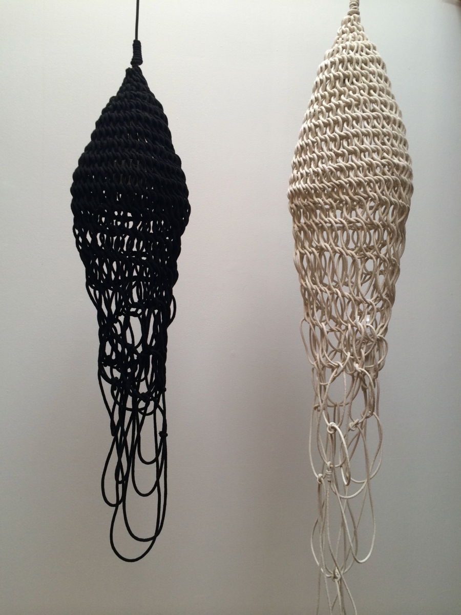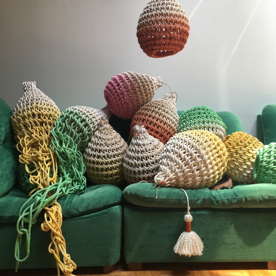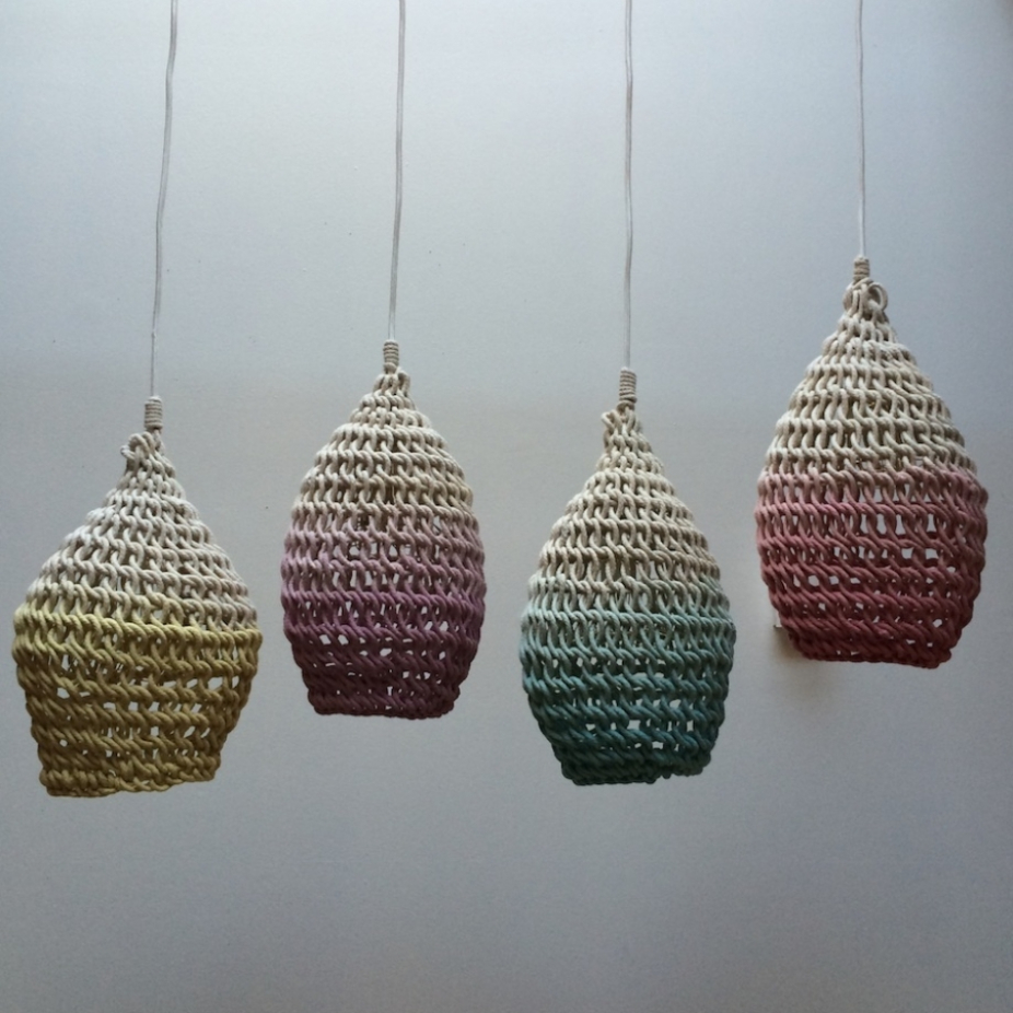 Lampes, objets décoratifs et sculptures en différents types de corde, réalisés en exemplaire unique et petite série par des techniques de tricot.