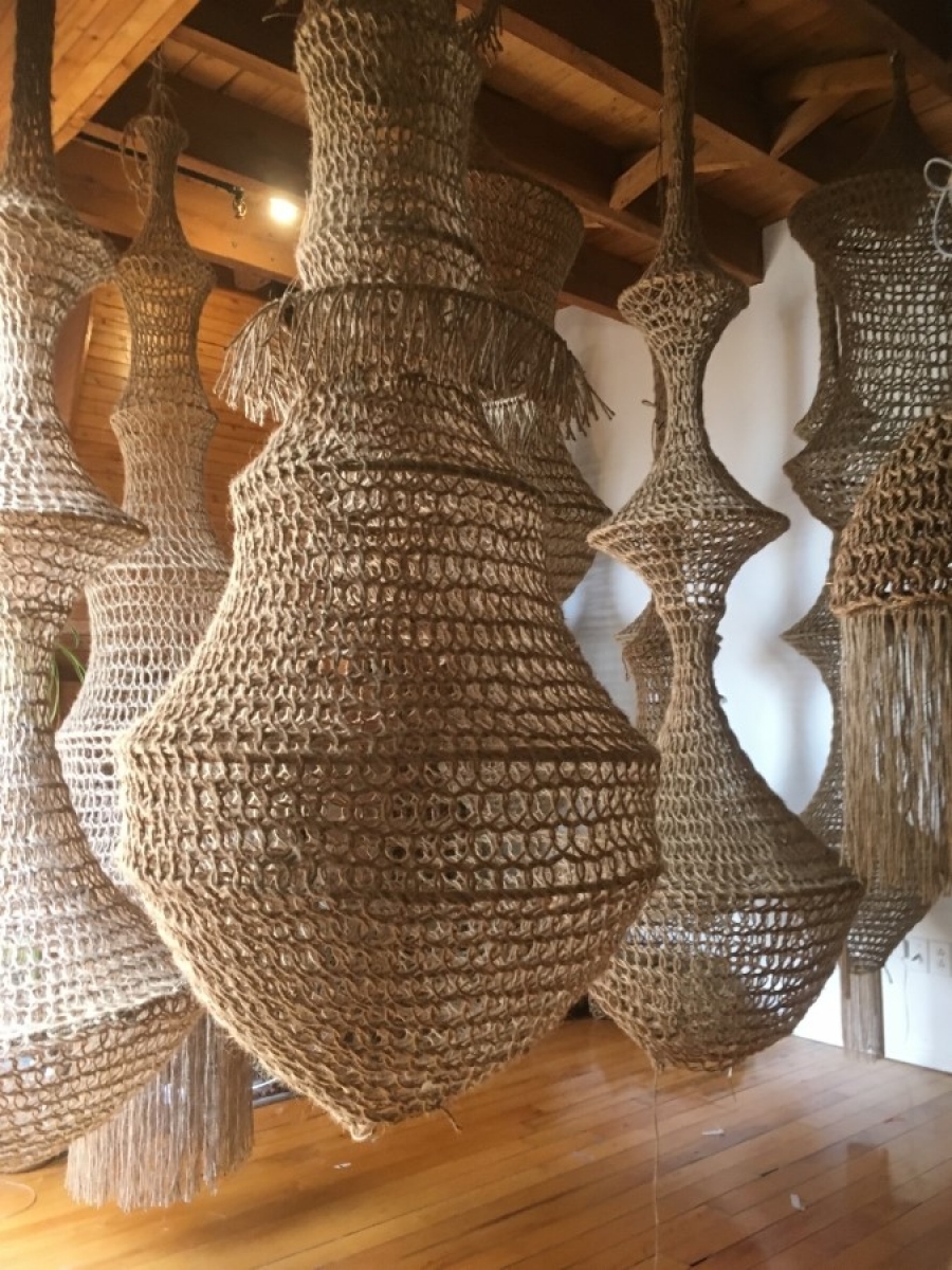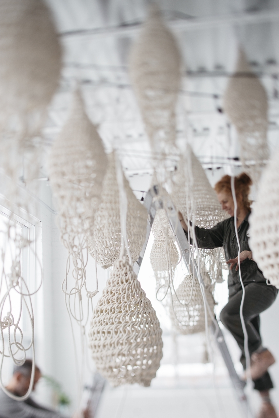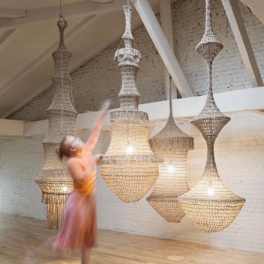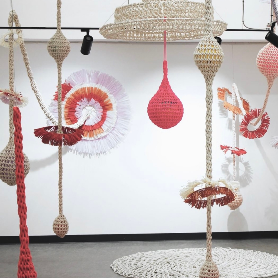 Lampes, objets décoratifs et sculptures en différents types de corde, réalisés en exemplaire unique et petite série par des techniques de tricot.