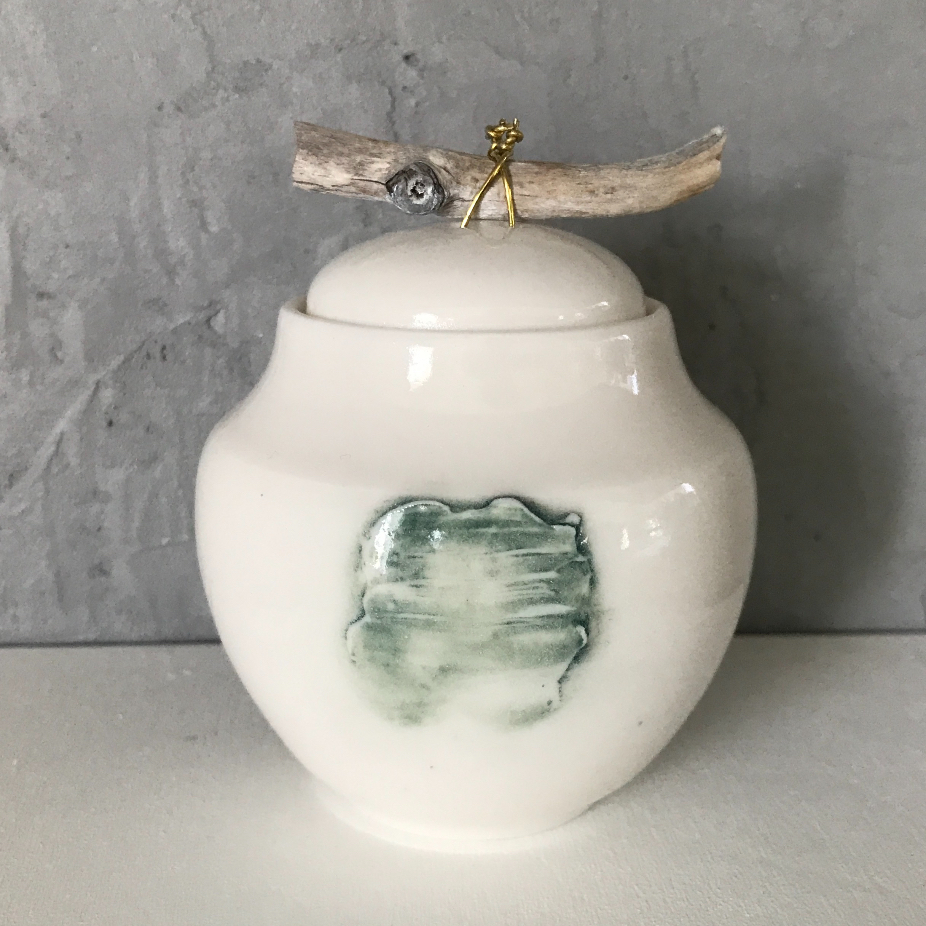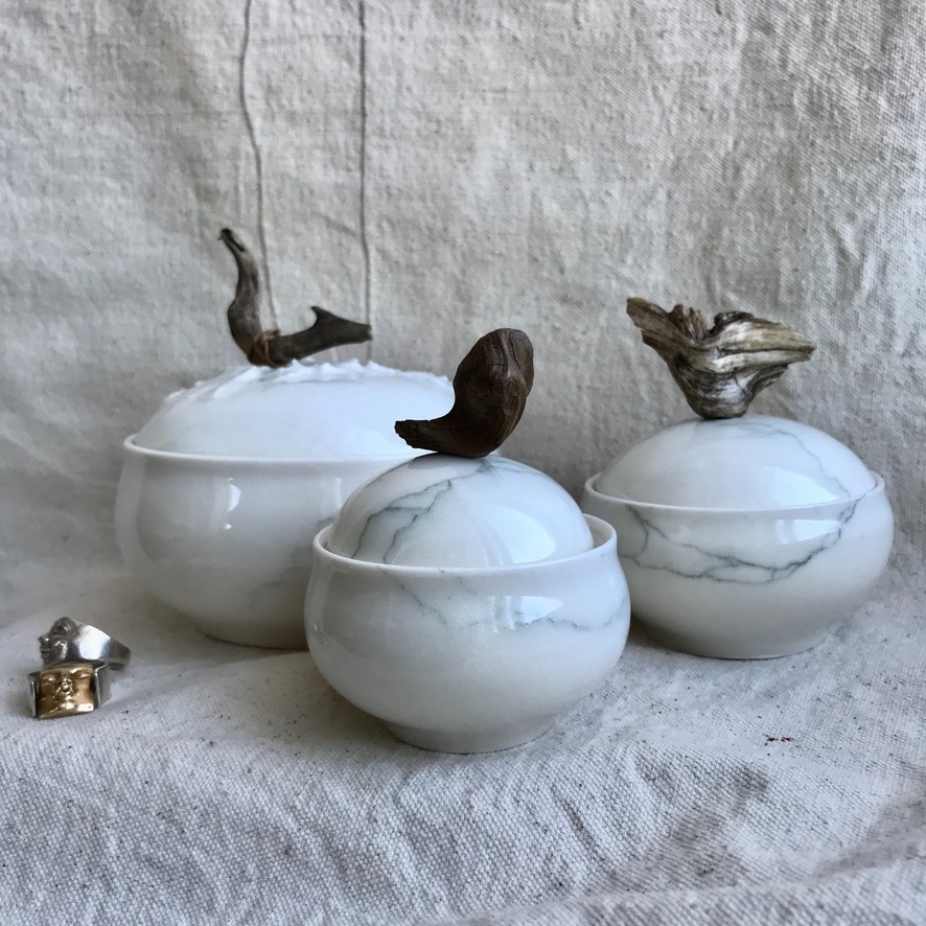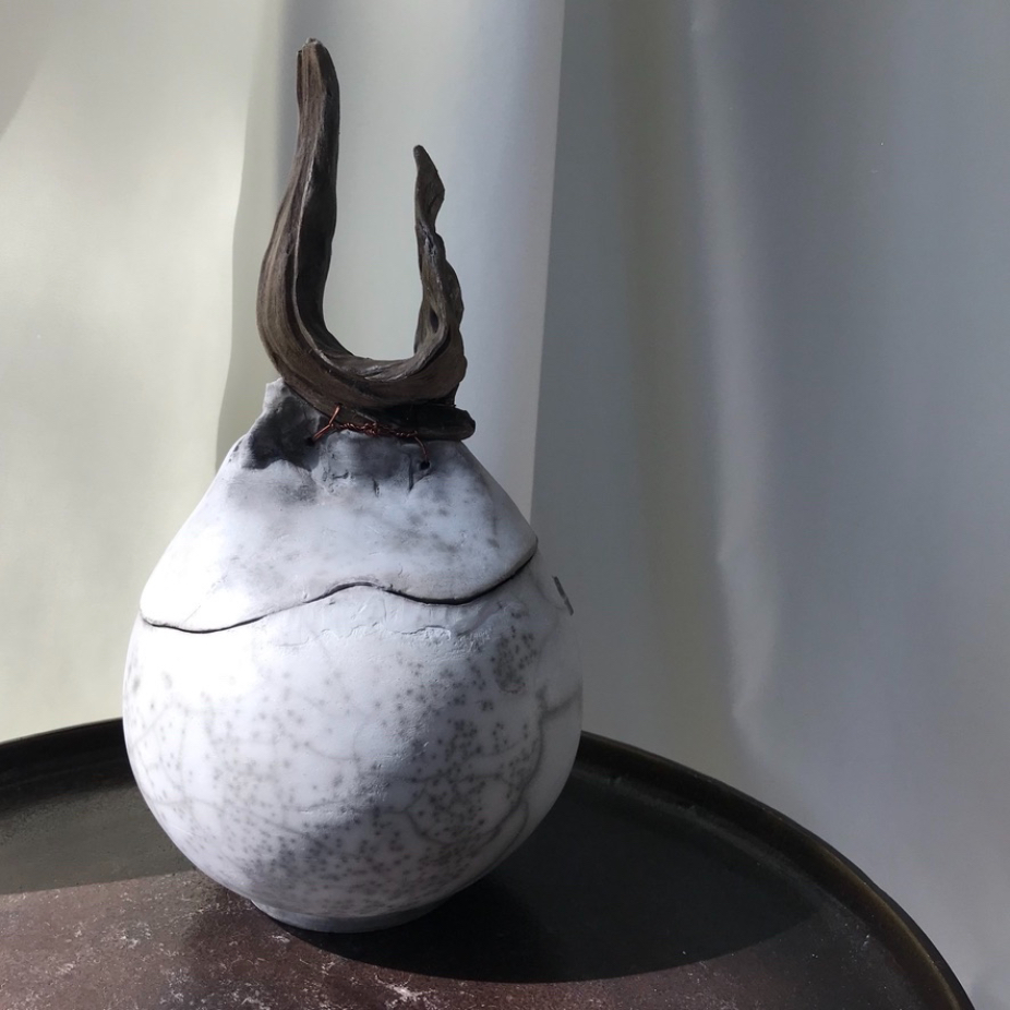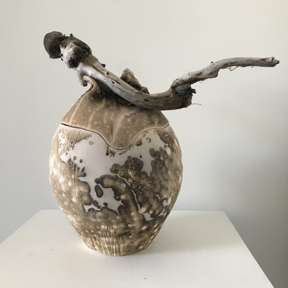 Céramiques et porcelaines décoratives et/ou utilitaires, tournées, puis façonnées pour obtenir des formes organiques. Urnes funéraires technique raku et/ou obvara avec bois flottés.