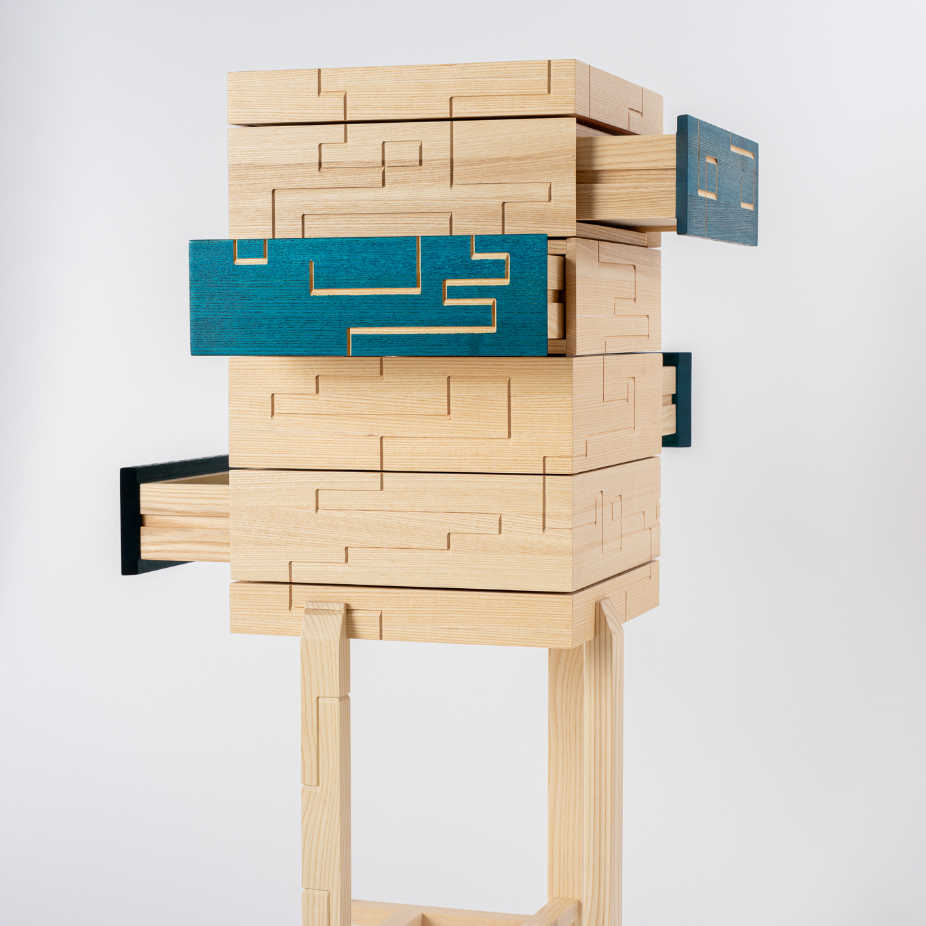 Juliette Huneau, artiste ébéniste d’origine française établie au Canada, puise dans son double parcours culturel un équilibre entre savoir-faire traditionnel et approche contemporaine. Formée en France (CAP, BMA) puis à l’École d’ébénisterie d’art de Montréal (DEC), elle s’appuie sur une solide base technique nourrie par une sensibilité poétique et un grand souci du détail, donnant vie à des créations mêlant esthétique, fonctionnalité et réflexion conceptuelle. Alliant techniques artisanales et innovations mécaniques, elle conçoit des œuvres de mobilier énigmatiques qui dépassent leur simple fonction utilitaire. Inspirées par les cabinets secrets et les univers interactifs, ses pièces, pensées comme des puzzles, invitent l’utilisateur à interagir, à explorer et à révéler des secrets cachés. Cette approche ludique et narrative met en scène un dialogue subtil entre décor, geste et imagination. Cette philosophie se prolonge dans son travail sur mesure, où chaque projet s’enrichit de l’histoire et des inspirations de ses clients. Le tressage à la corde danoise, minutieux et répétitif, ajoute une dimension tactile et méditative, incitant à ralentir et à savourer l’instant. Ainsi, Juliette Huneau façonne des pièces uniques, profondément humaines, qui invitent à la contemplation, à l’exploration et à la réappropriation du temps.