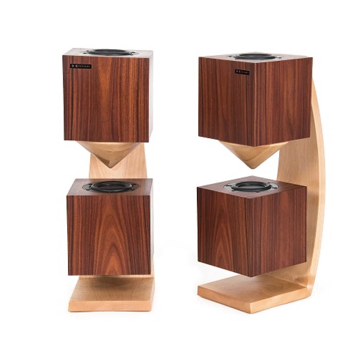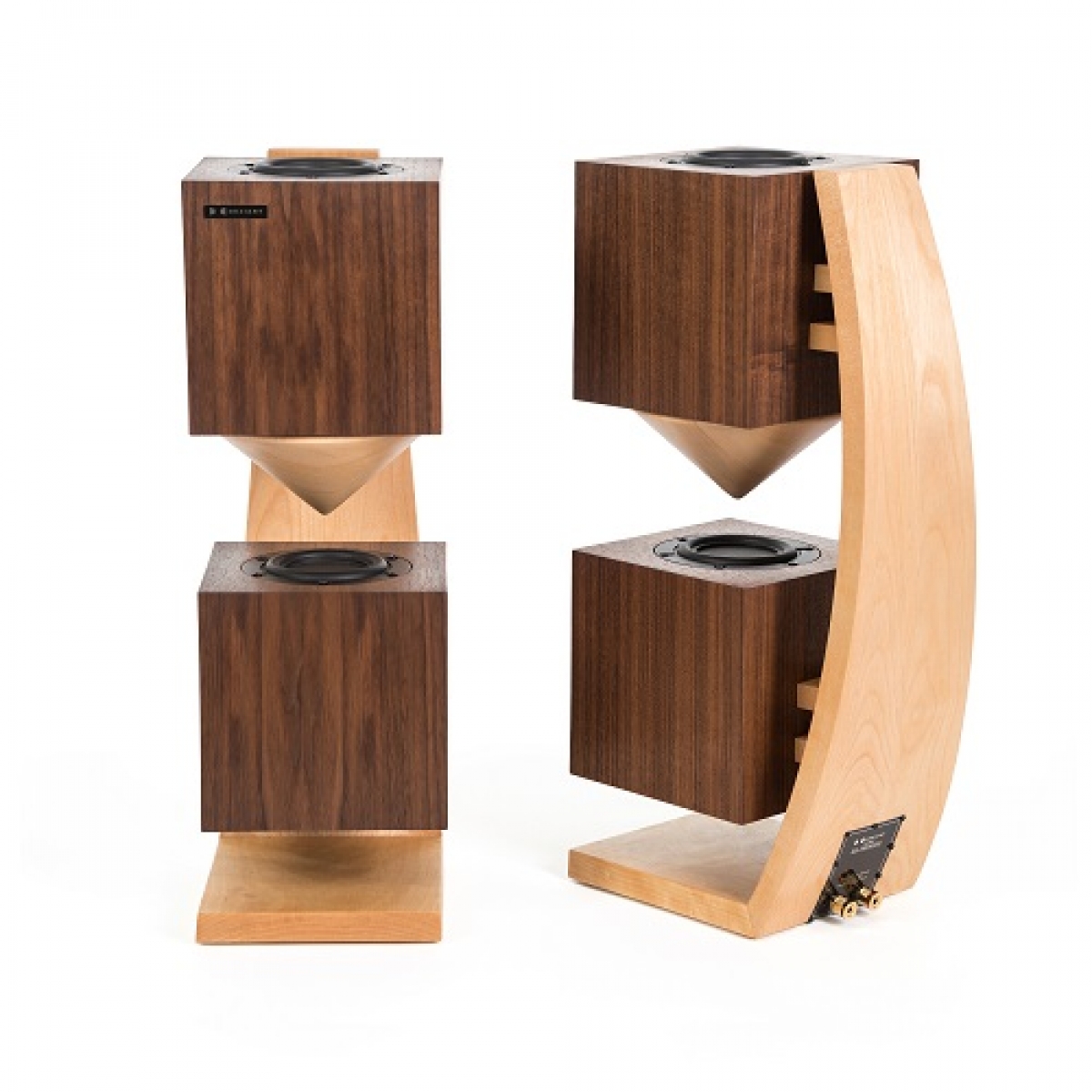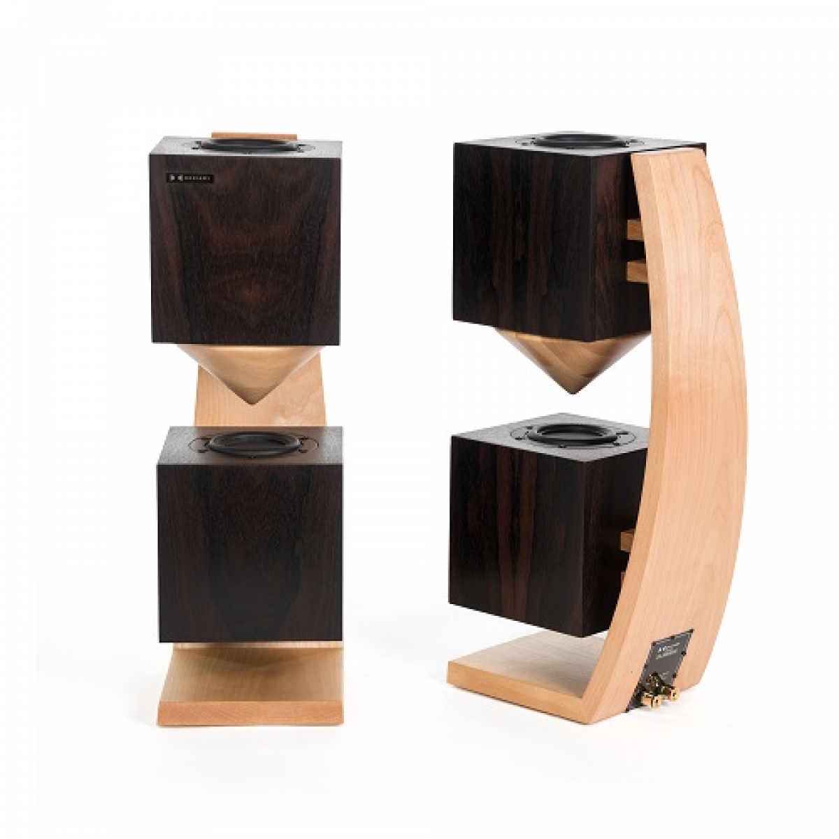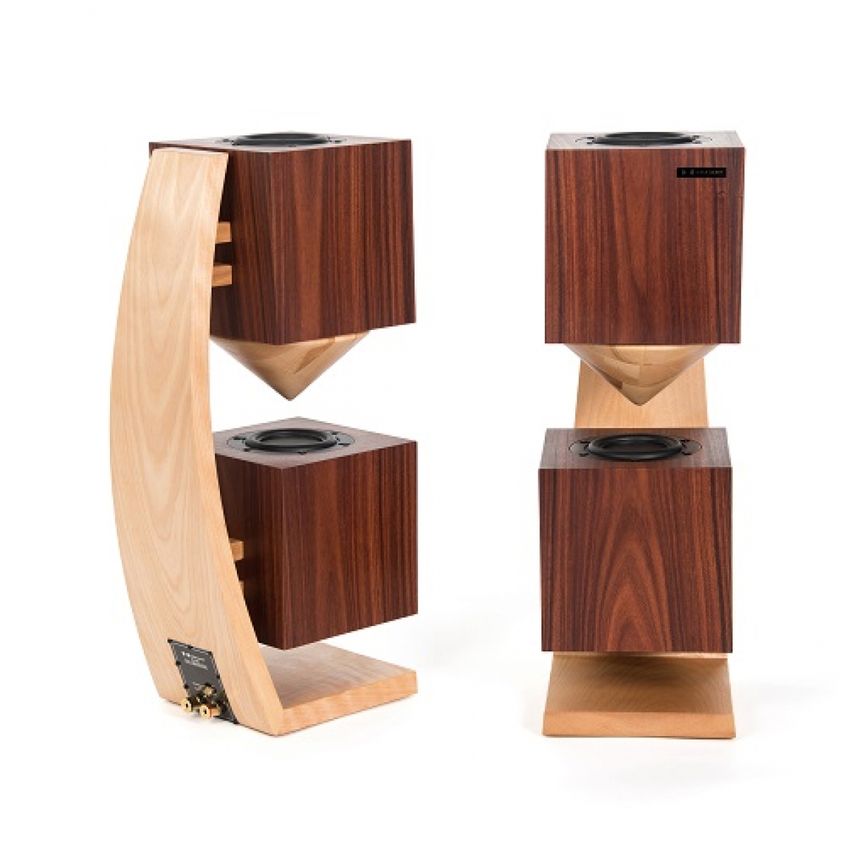 Haut-parleurs hi-fi en placage de bois haut de gamme, réalisés en petite série par des techniques d’ébénisterie et tournage sur bois.