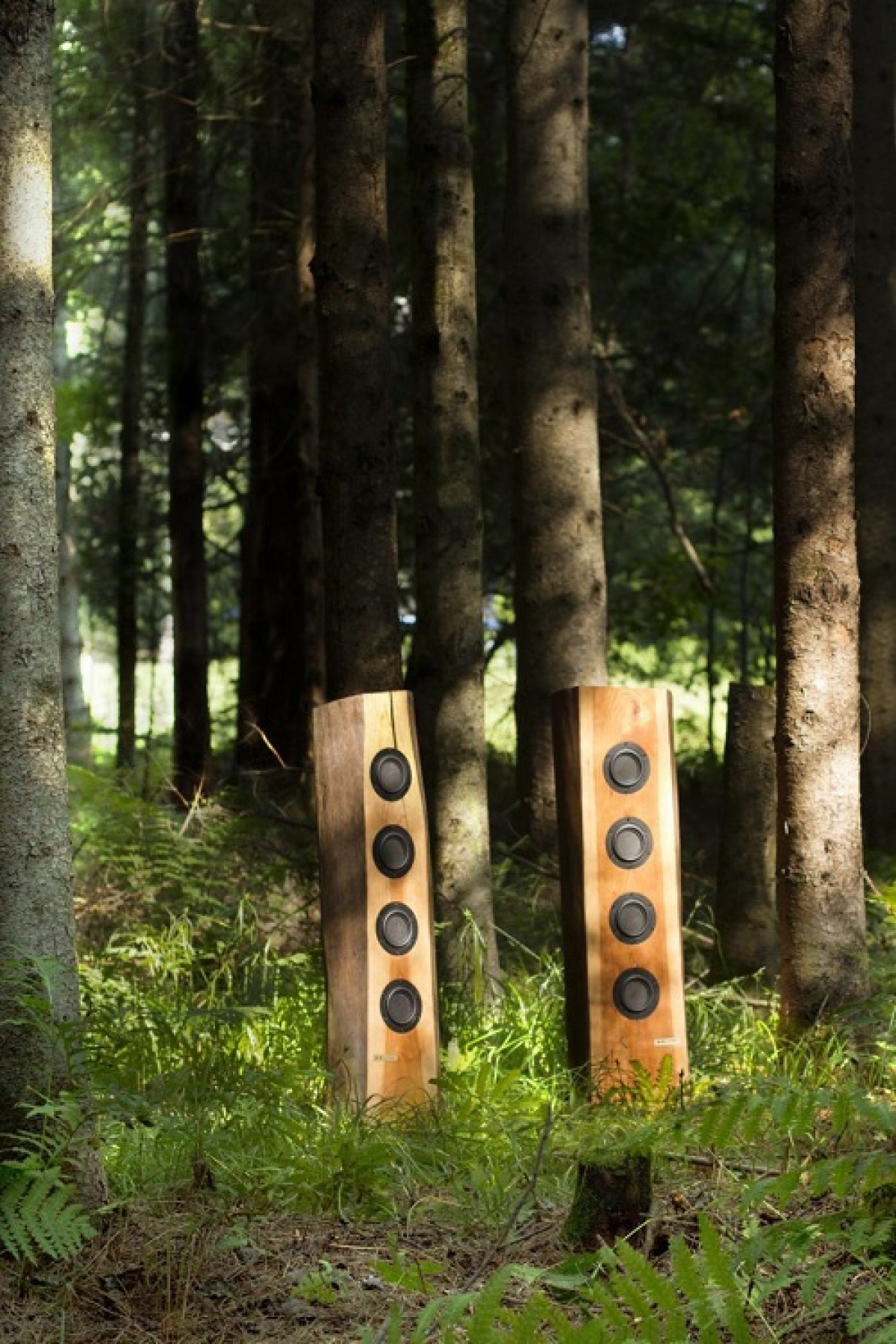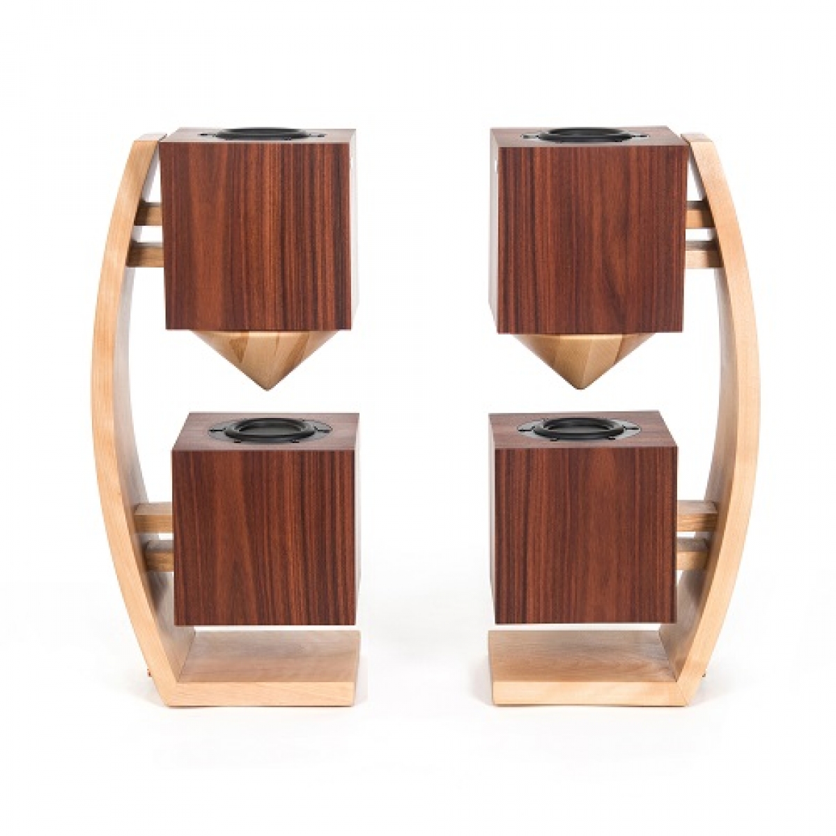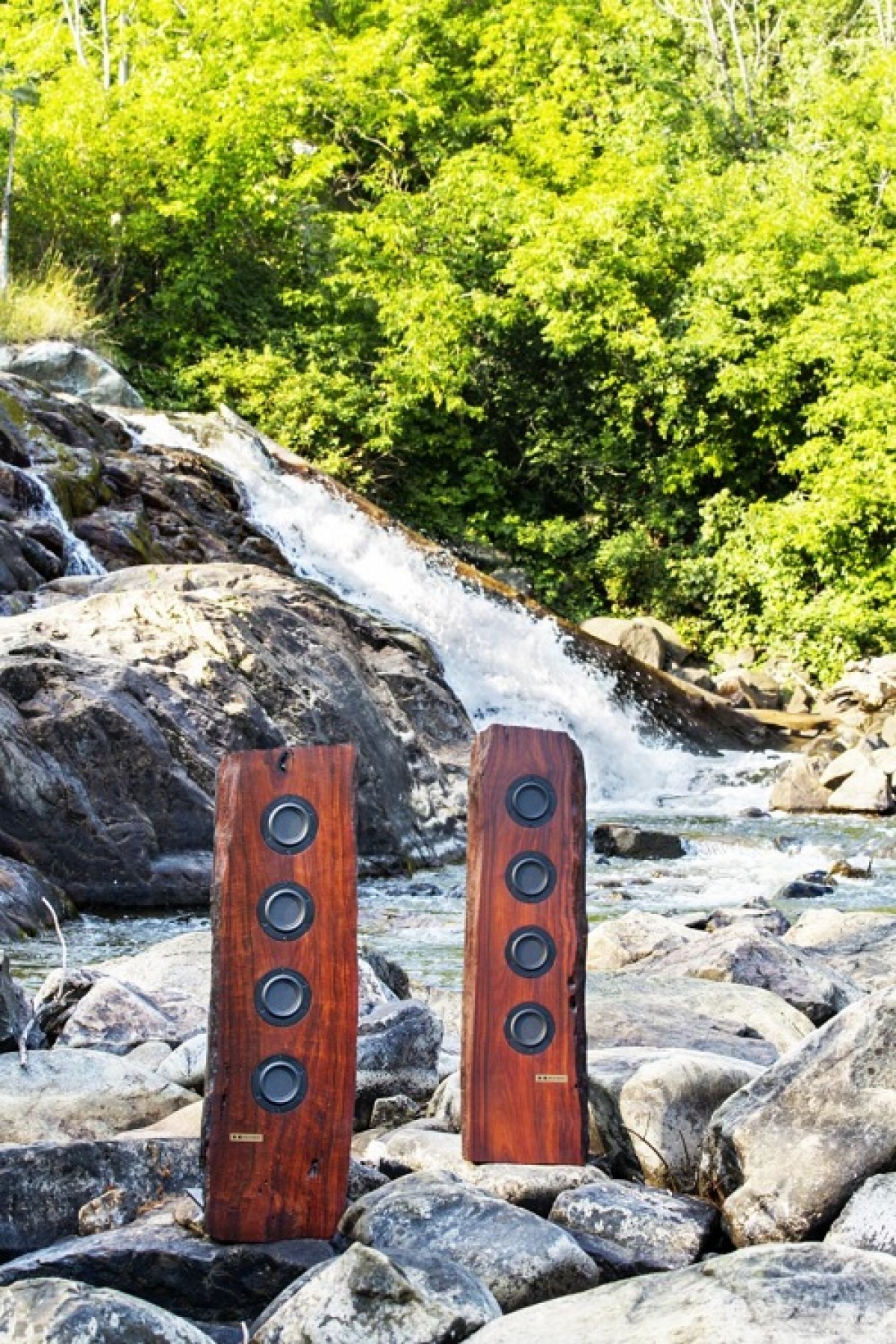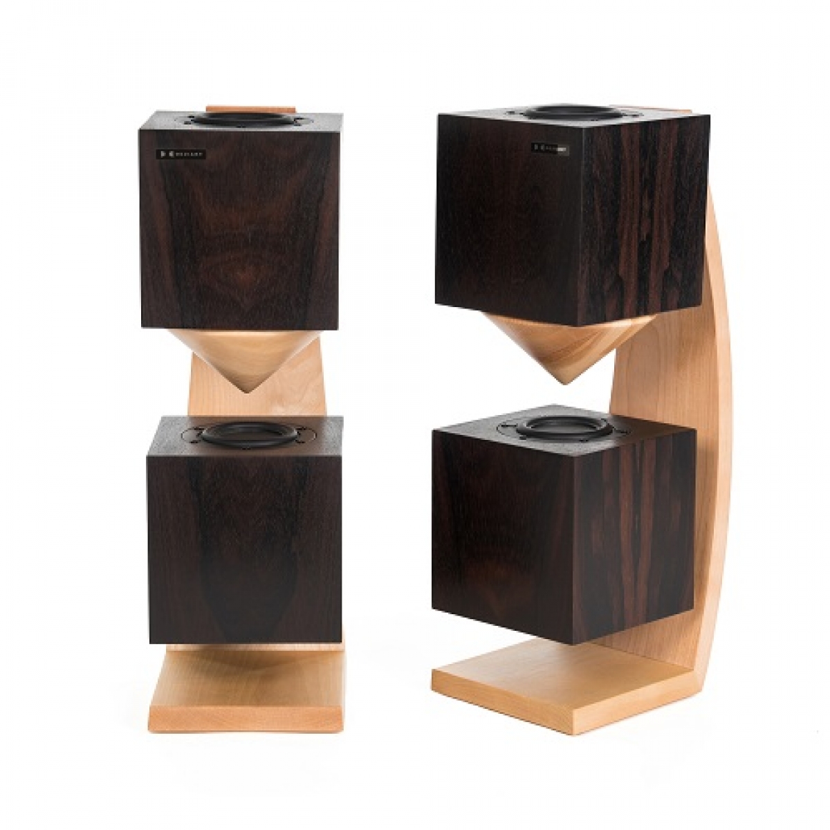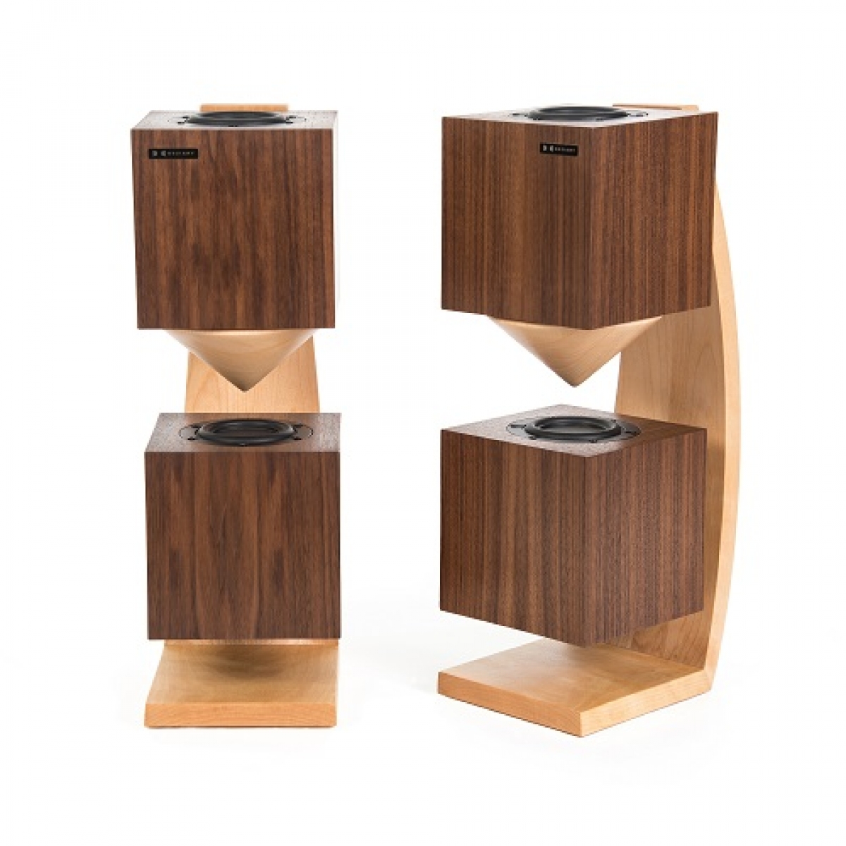 Haut-parleurs hi-fi en placage de bois haut de gamme, réalisés en petite série par des techniques d’ébénisterie et tournage sur bois.