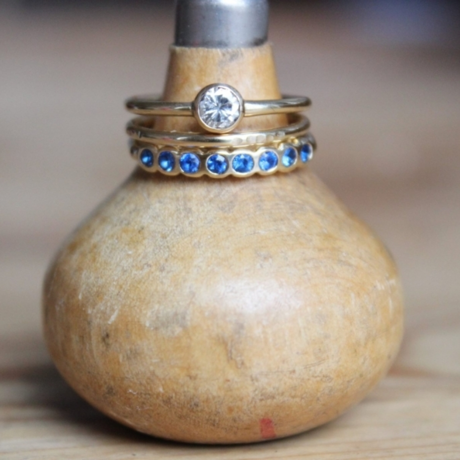 Bijoux or éthique (Fairmined) et pierres fines, réalisés en exemplaire unique et petite série par des techniques de joaillerie (construction, sculpture à la cire perdue et émail à froid) : alliances, bagues, colliers, etc.
