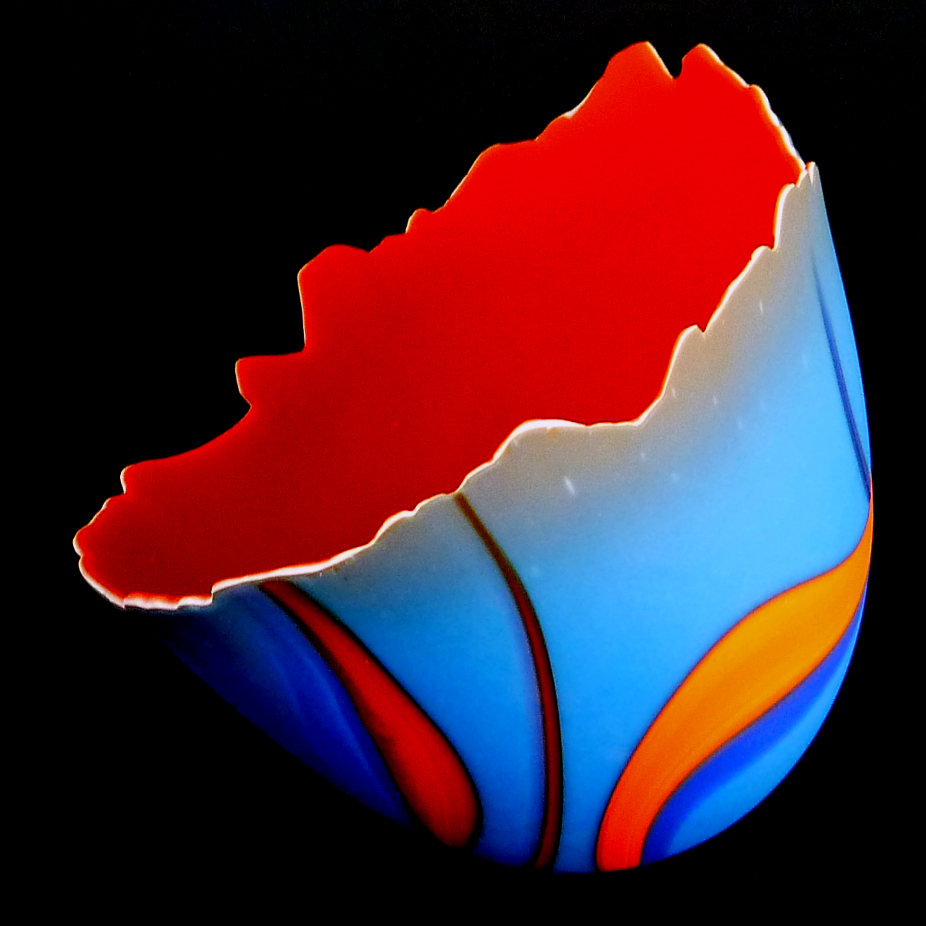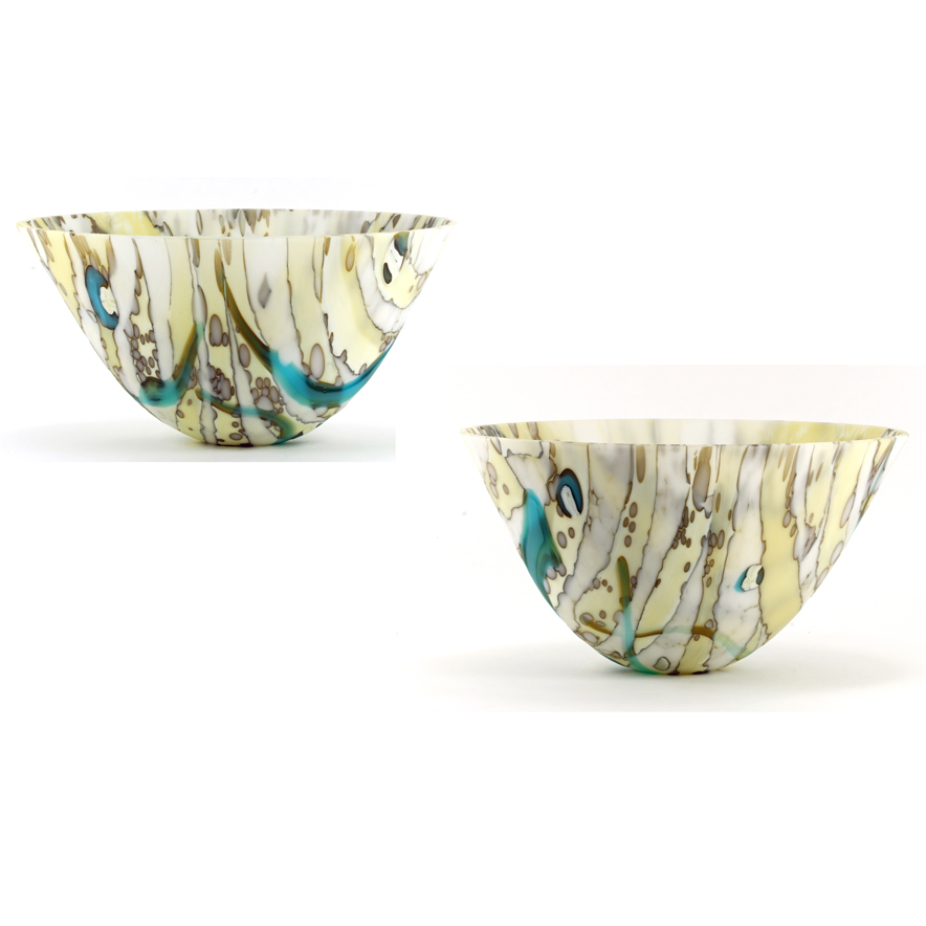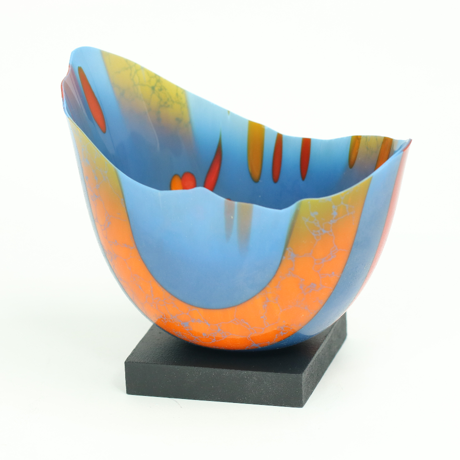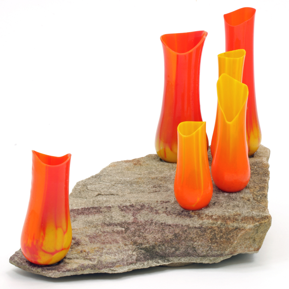 Vases, sculptures et panneaux en verre réalisés en exemplaire unique à l’aide de différentes techniques de verre fusionné.