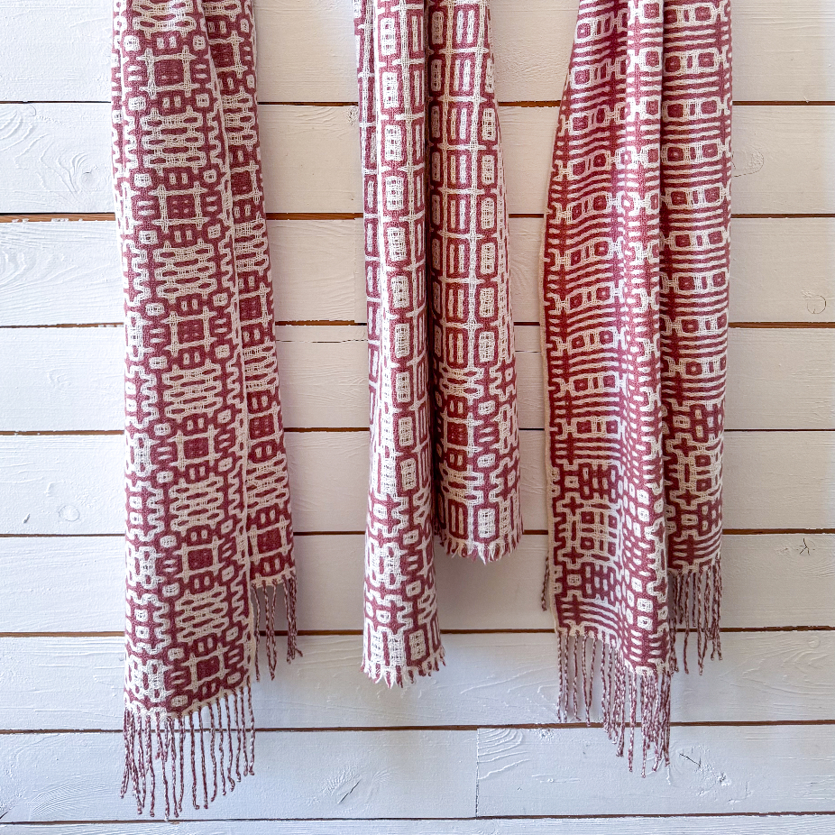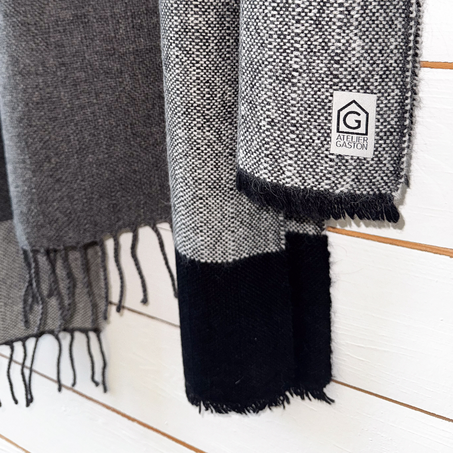 Objets utilitaires en laine 100% vierges, lin et coton, réalisés en exemplaire unique et petite série par des techniques de tissage : couvertures, nappes, foulards, écharpes, châles.