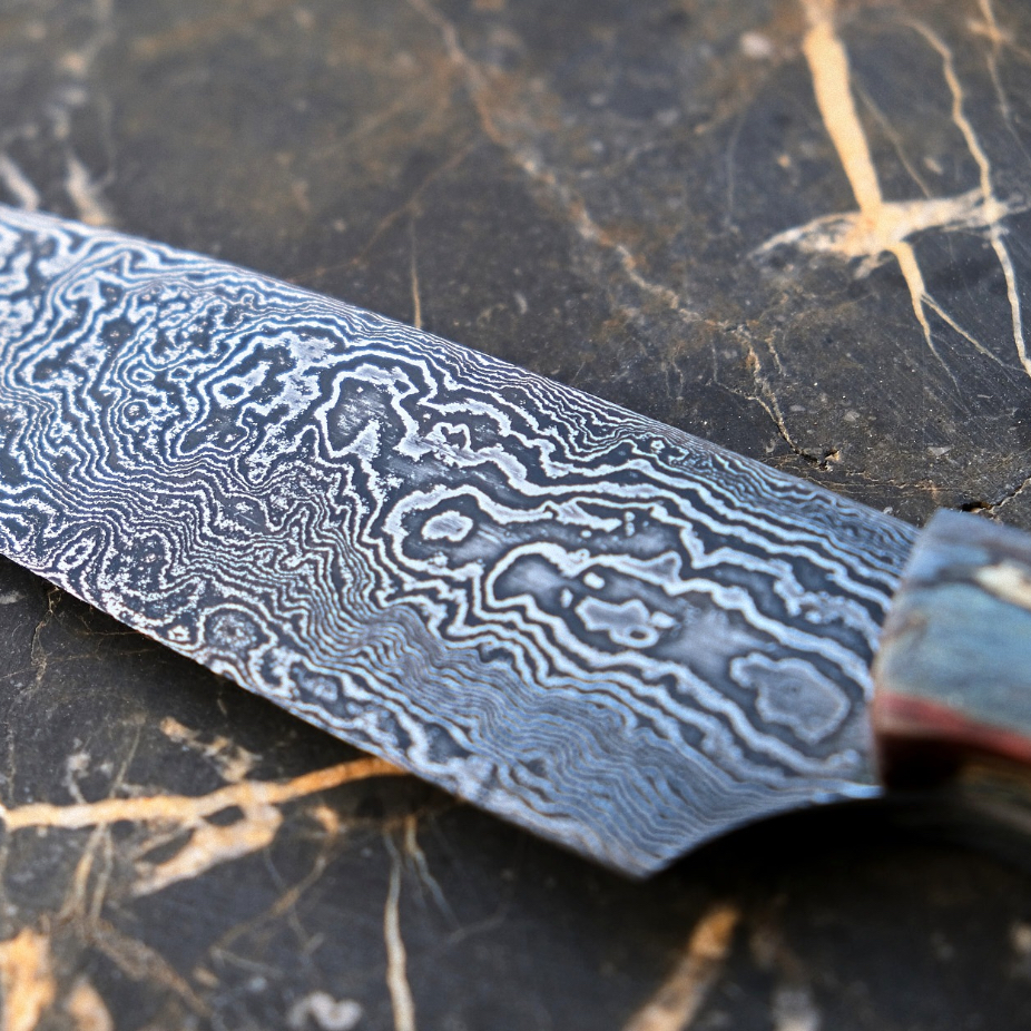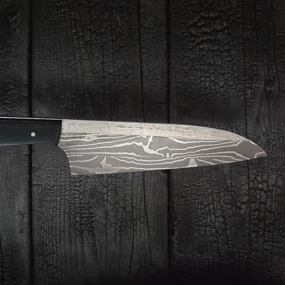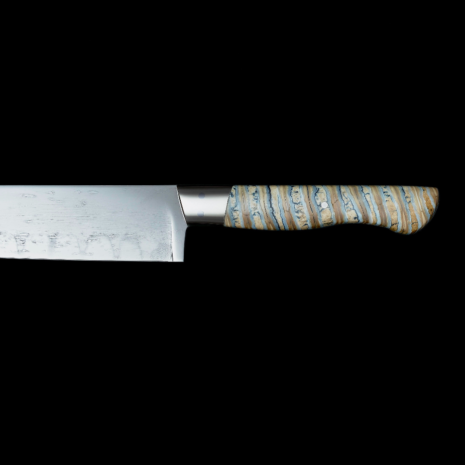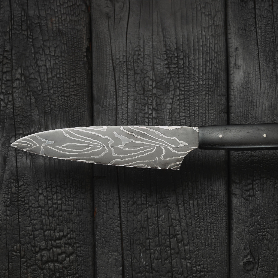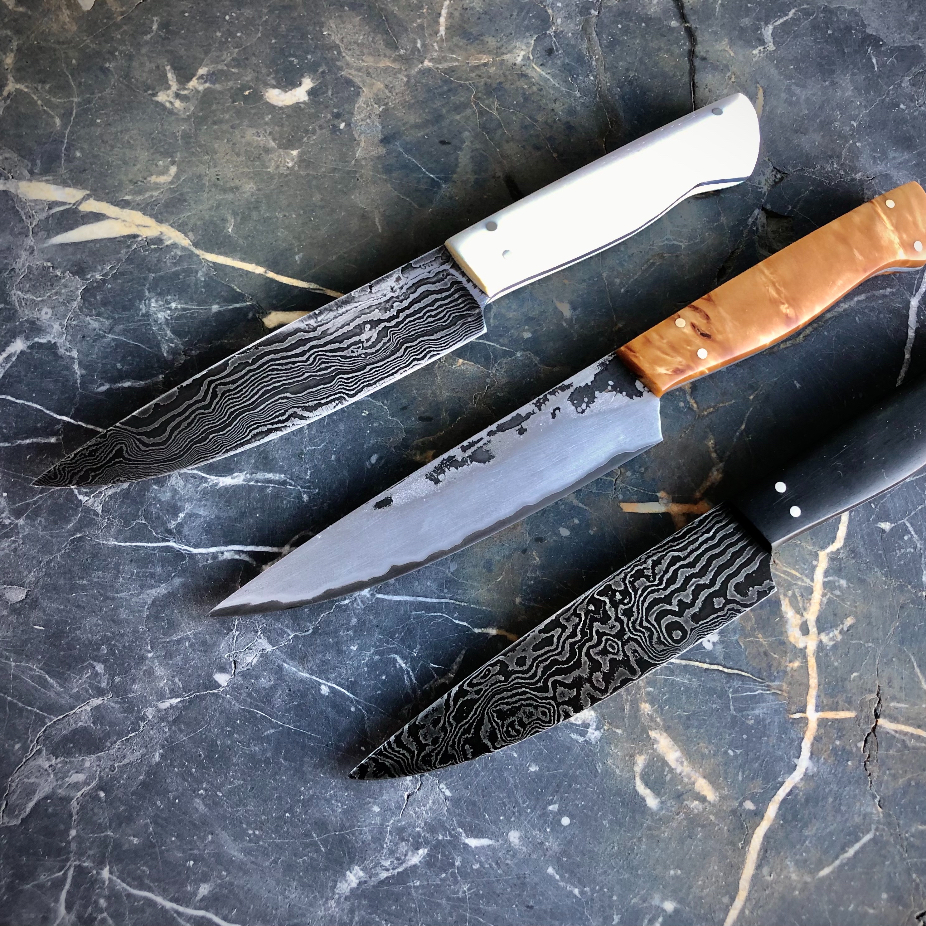 Couteaux en acier et inox, réalisés en exemplaire unique et petite série par des techniques de coutellerie (forgeage, sablage et polissage).