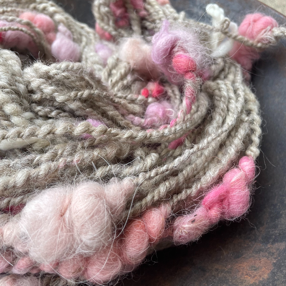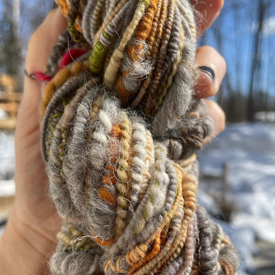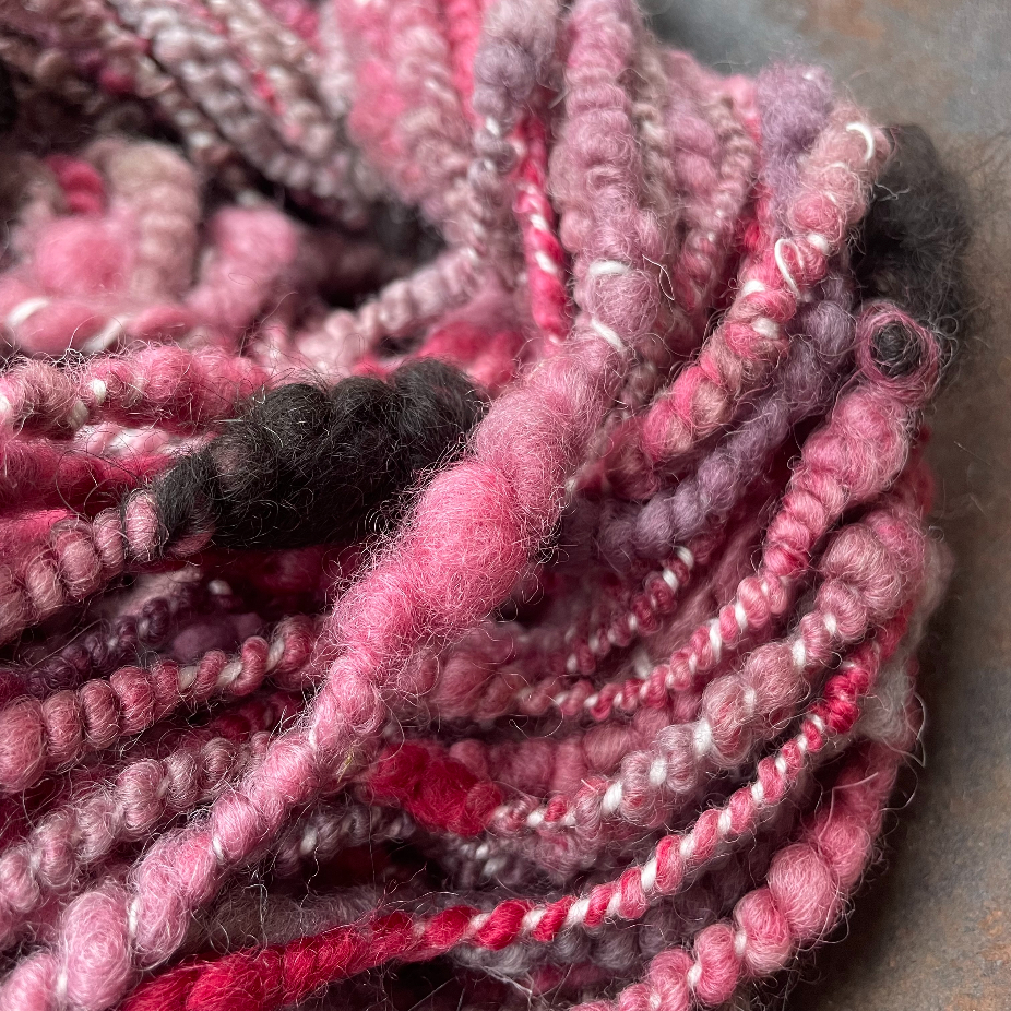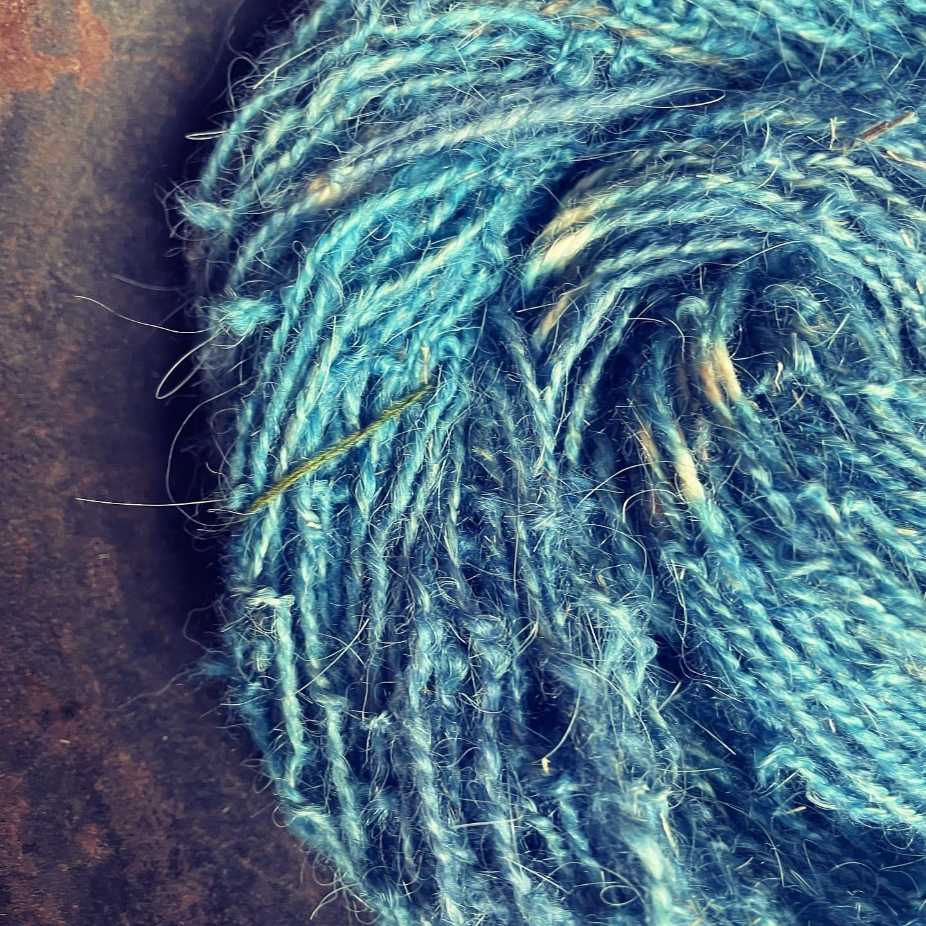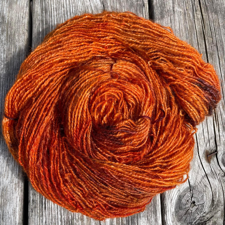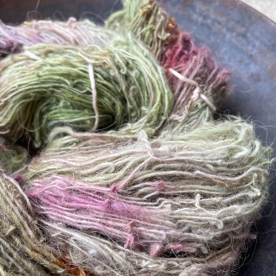 Filages au rouet ou au fuseau, en fil simple ou double, et parfois teints par la suite, teinture naturelle ou acide.