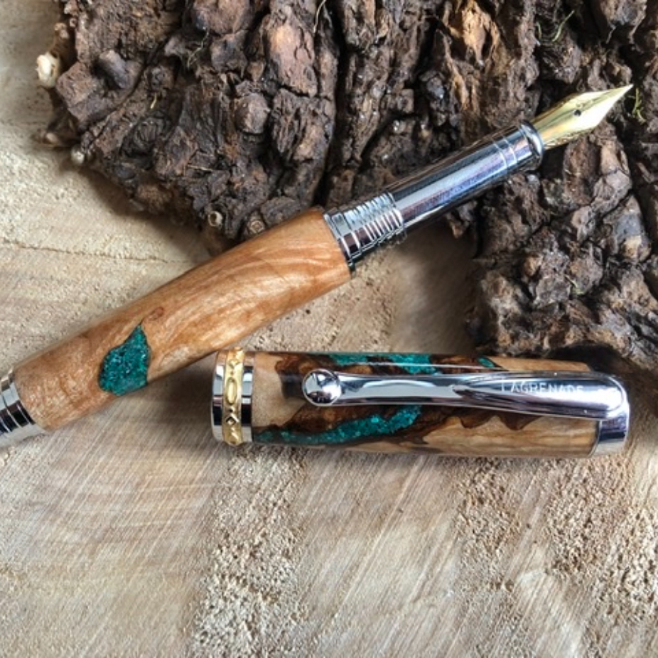 Stylos et plumes fait de fusion de loupe d’érable et acrylique, bois d’exception, acrylique, bois avec insertion de pierres semi-précieuses. Bijoux, collier en fusion de bois d’érable et résine.