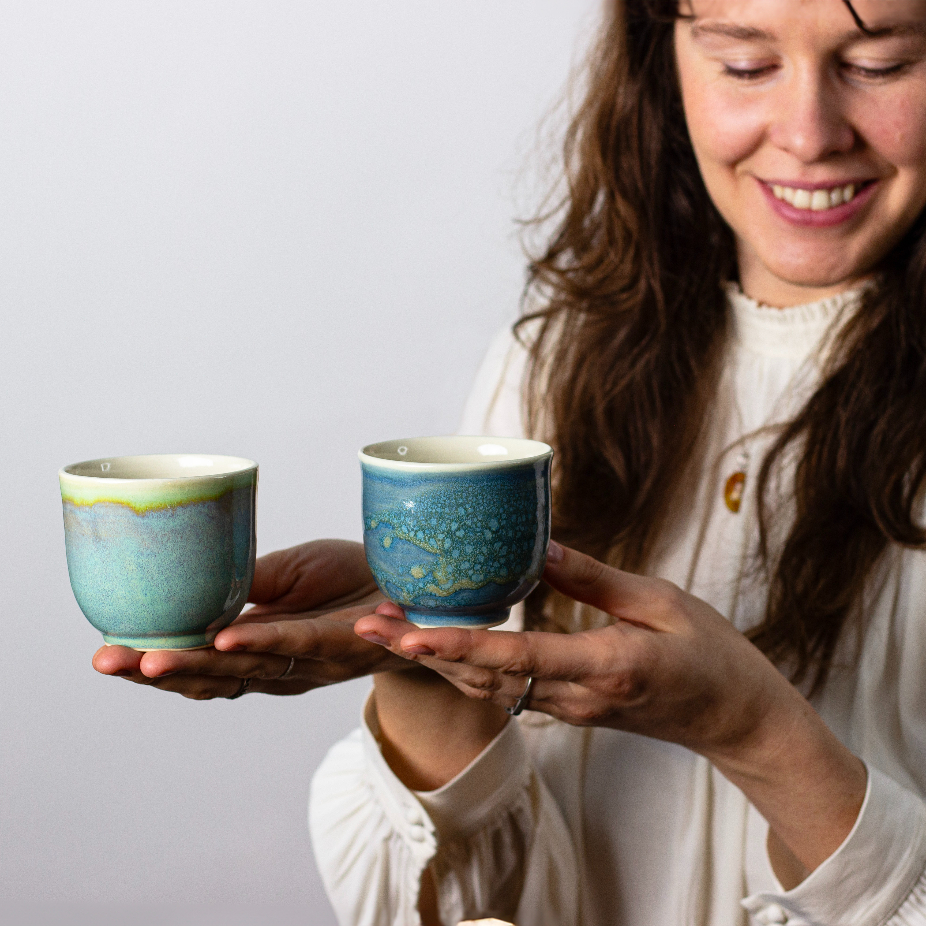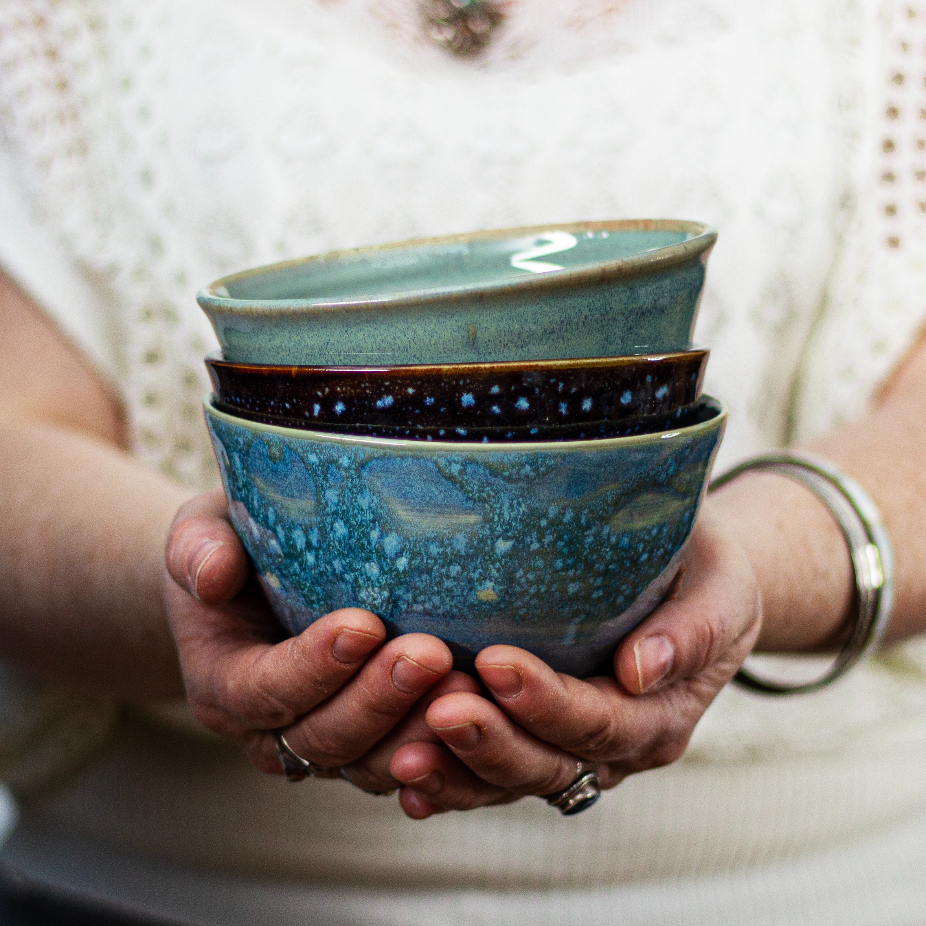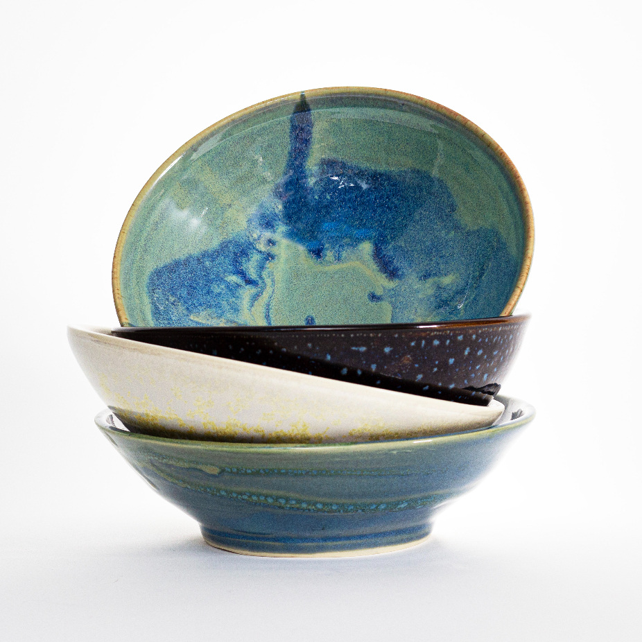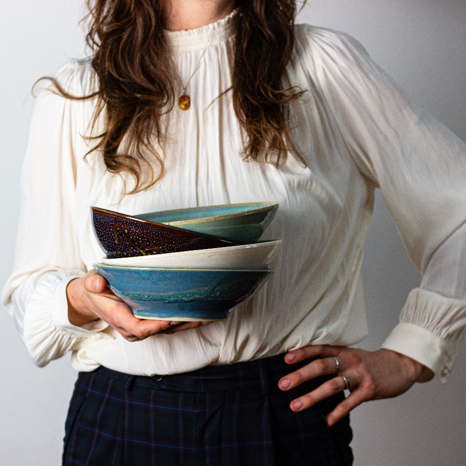 Objets utilitaires et décoratifs en céramique, réalisés en exemplaire unique et petite série par des techniques de tournage et façonnage : assiettes, saladiers, gobelets, tasses, bols, etc.