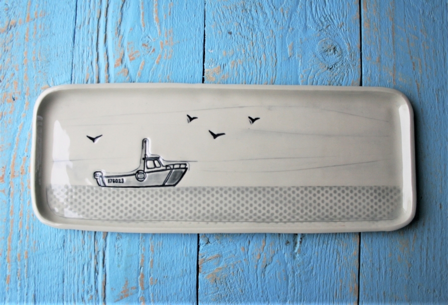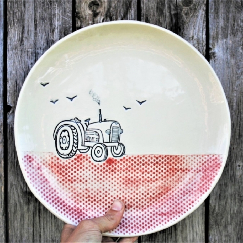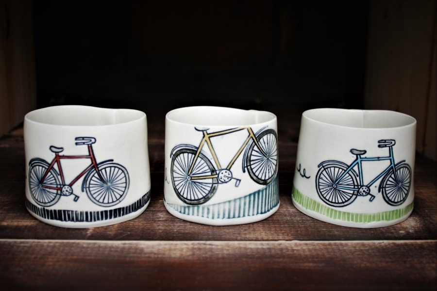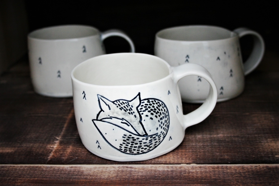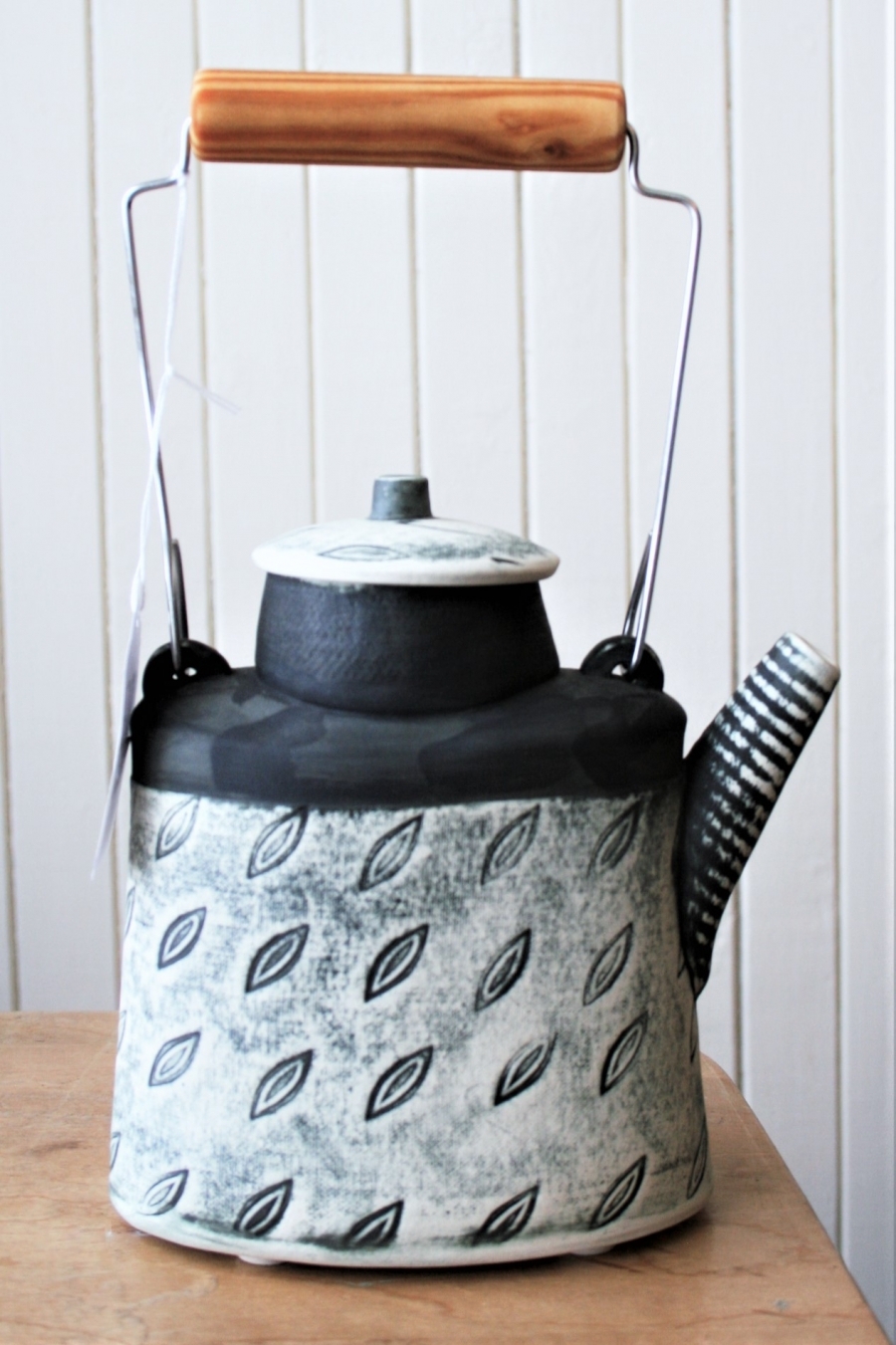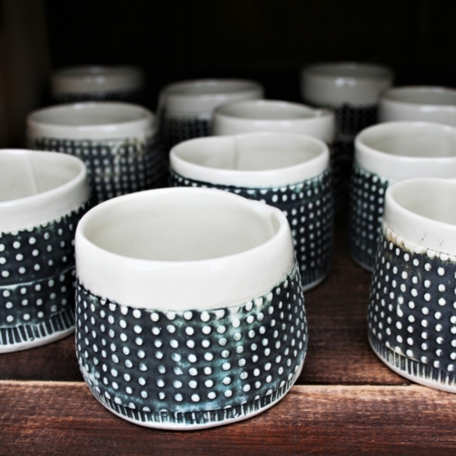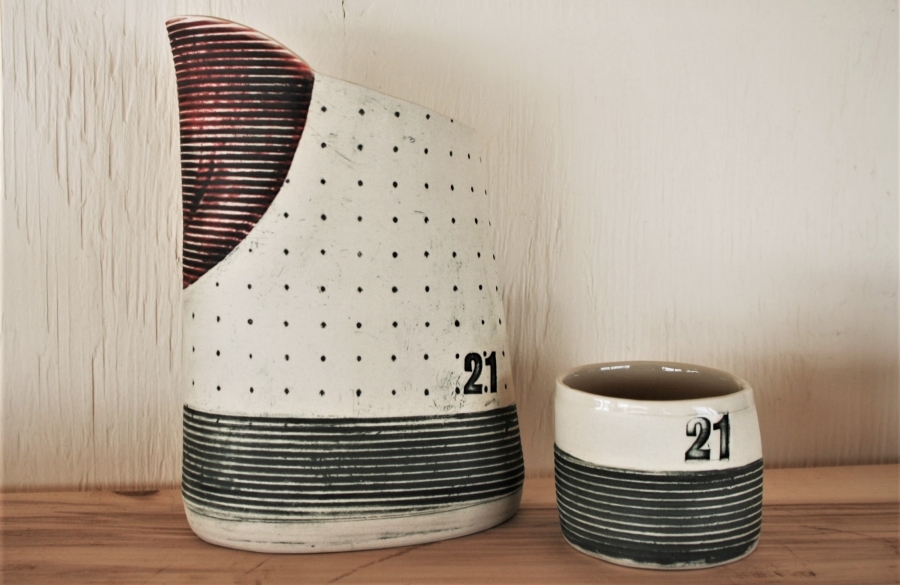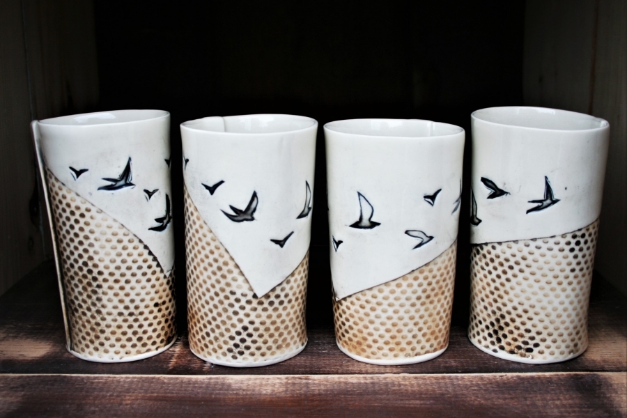 Objets utilitaires et décoratifs en grès, réalisés en petite et grande série par des techniques de modelage à la plaque et décoration : théières, gobelets, pichets, tasses, assiettes, etc.