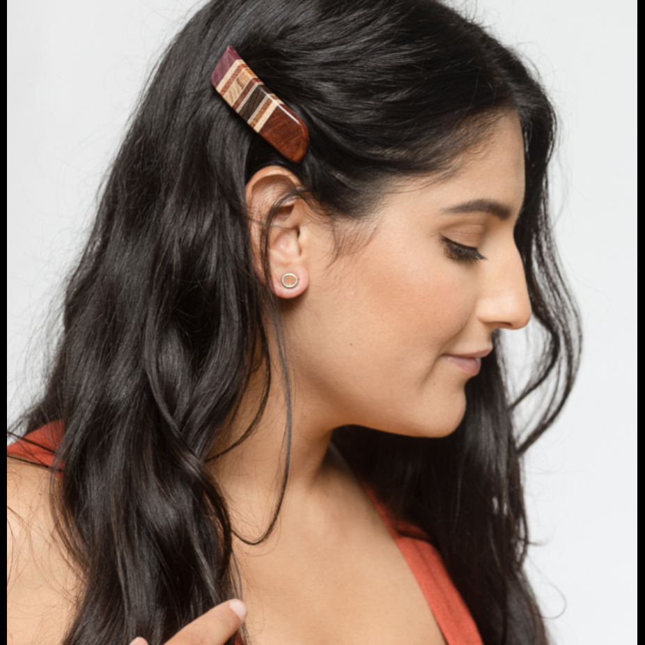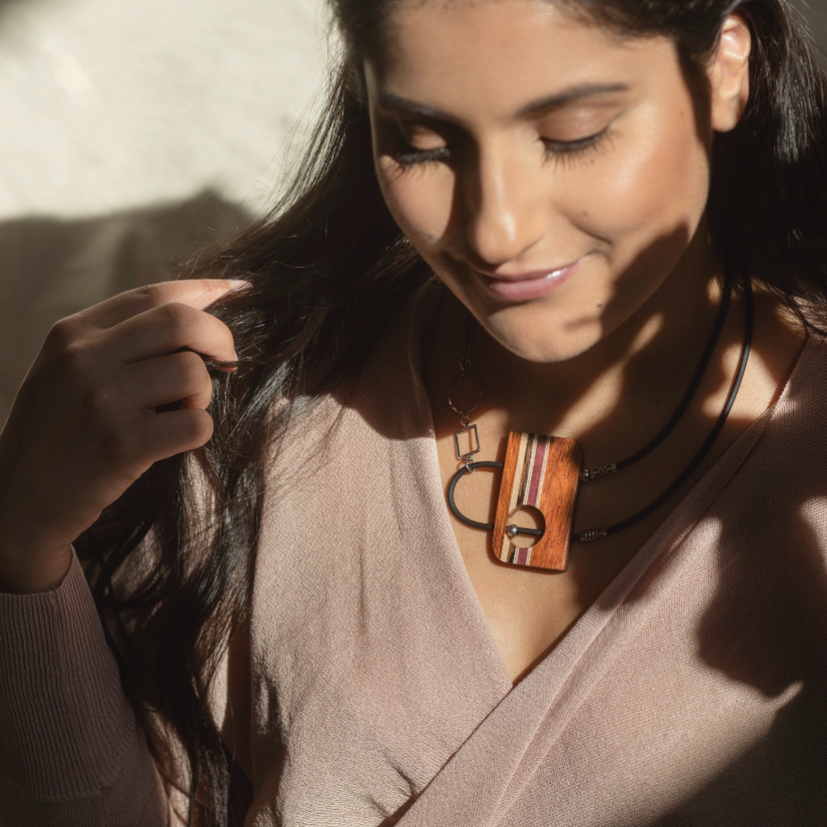 Bijoux et accessoires en bois. Isabelle Ferland exploite les motifs, les couleurs, les textures de différentes essences de bois comme l’amarante, le satiné rubané, le wengé et le zébrano. Elle en fait des mosaïques à partir desquelles elle conçoit des pièces originales, qui allient élégance et design contemporain. Sa collection, entièrement faite à la main, comprend des colliers, des boucles d’oreilles, des bracelets, des barrettes, des pinces à cheveux et des baguettes à cheveux. Son travail solitaire soigné lui permet de veiller personnellement à toutes les étapes de la création et de la confection de ses bijoux et accessoires.