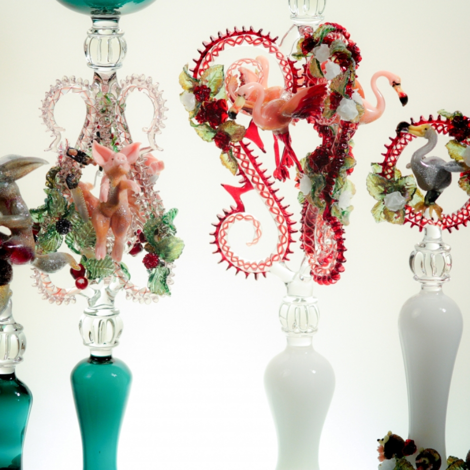Bijoux, objets utilitaires et pièces uniques en verre sodocalcique et verre borosilicate : coupes réalisées au chalumeau, verres, sculptures.