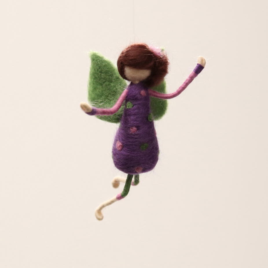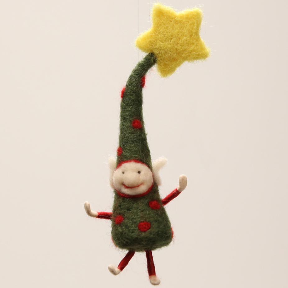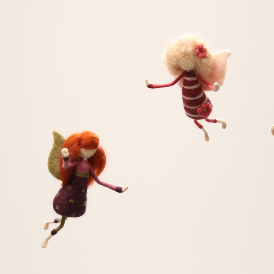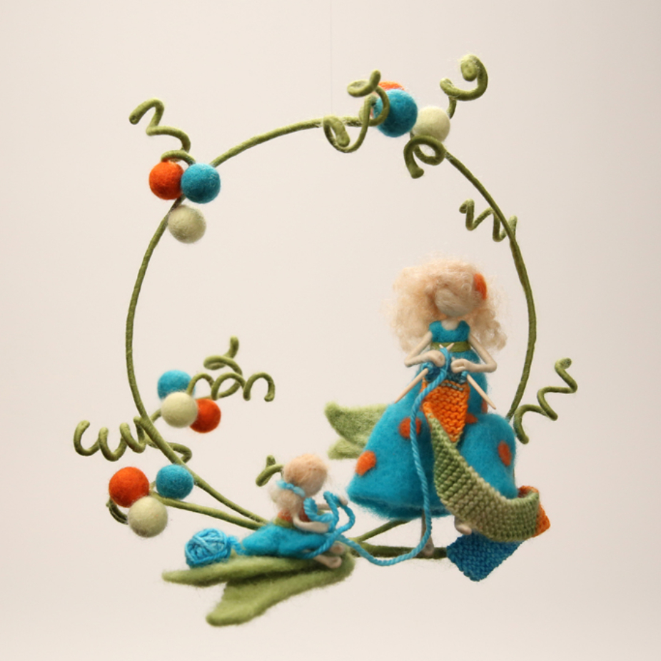 Objets utilitaires et décoratifs en feutre, réalisés par des techniques de feutrage de laine : veilleuse, mobiles pièces montées, lutins de Noël, fées, marraires, lutins feuilles, porte-clés et pochettes.