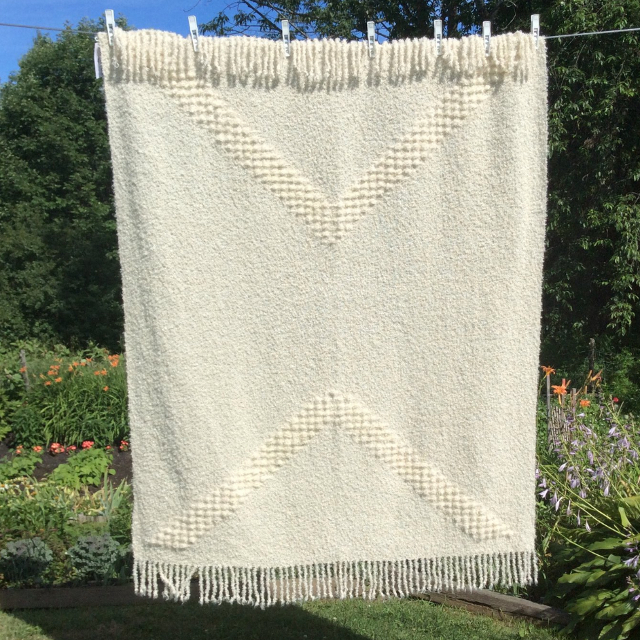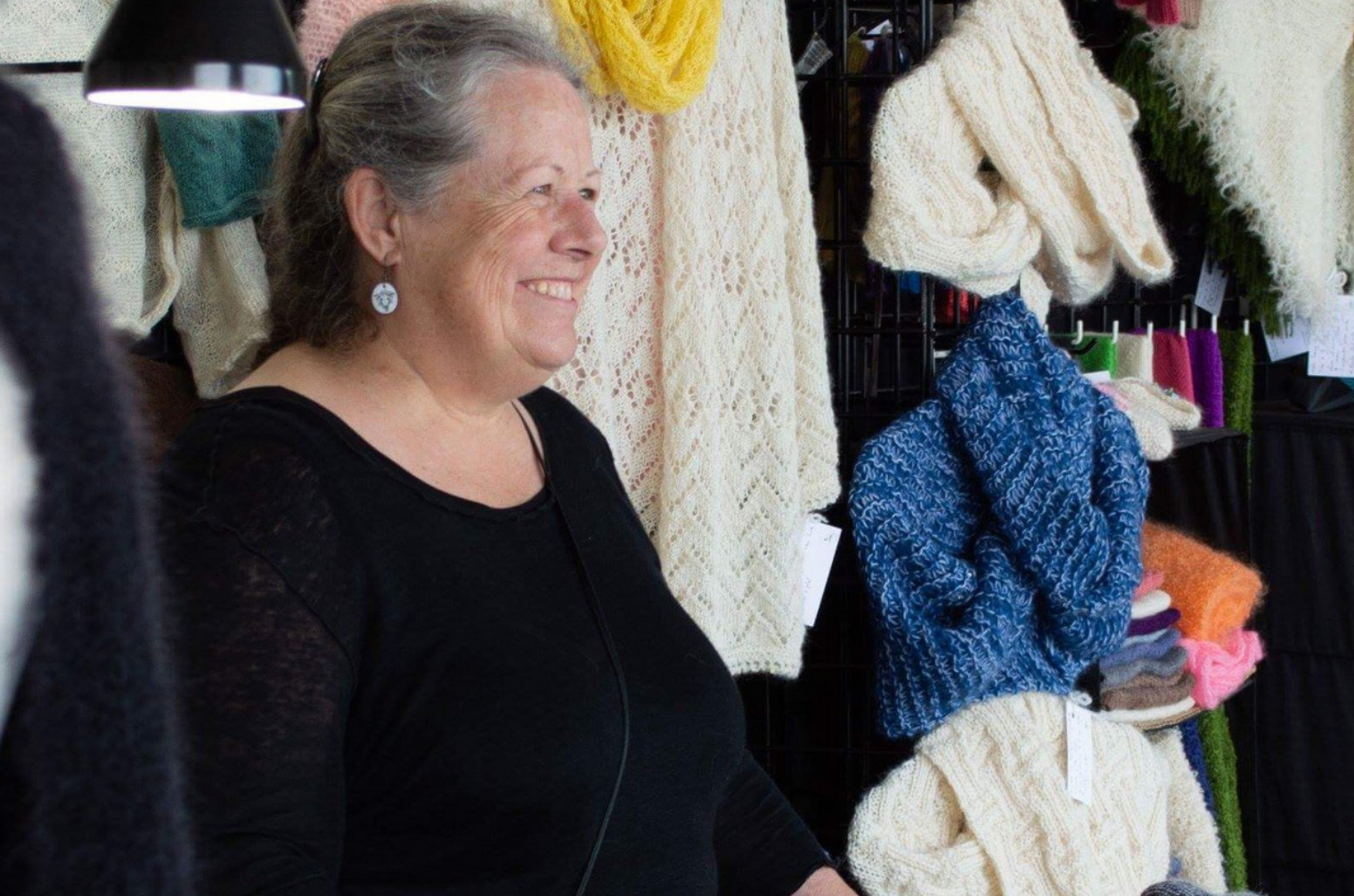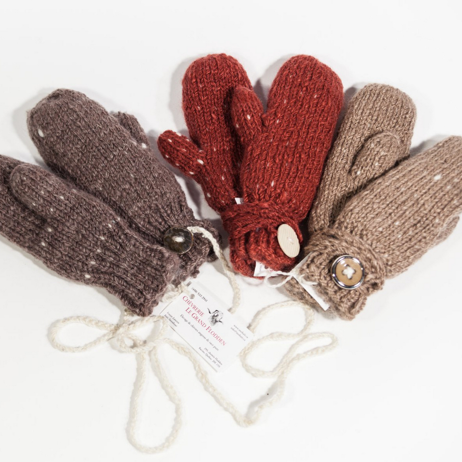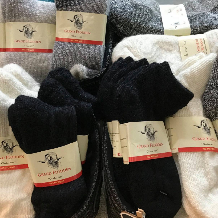 Louise Lauzon et Ivan Steenhout, propriétaires de la Chèvrerie Le Grand Flodden, située à Racine dans les Cantons de l’Est, y ont pendant près de trente ans élevé des chèvres angoras de race pure. Mais une page s’est tournée : leur troupeau qui comptait une centaine de têtes a été vendu il y a peu. Ils disposent encore cependant d’une bonne réserve de mohair accumulé au fil des années et poursuivent donc leurs activités de transformation artisanale et de vente de produits finis en mohair. Louise, habile tricoteuse, continue de confectionner à la main divers vêtements et accessoires en mohair (chandails, châles, foulards, tuques, mitaines, etc.) qu’elle vend dans plusieurs Salons et Expositions, et notamment dans les Salons de métiers d’art du Québec, tandis qu’Ivan s’occupe des relations avec les magasins et de la mise en marché des produits manufacturés en plus grande série, tels les bas ou les couvertures.