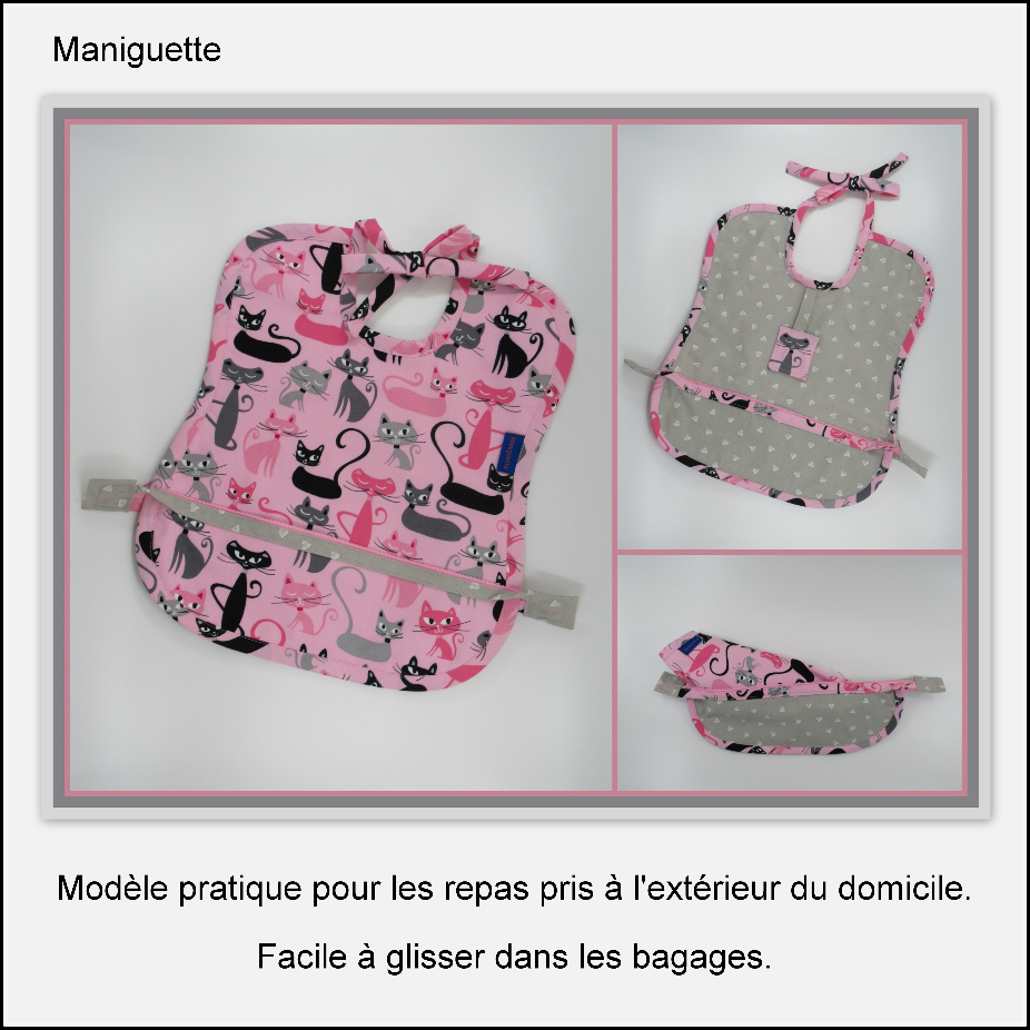 Maniguette se spécialise dans les confections haut de gamme, en portant une attention particulière à la réalisation de chaque article (bavoir, couvre-tout, tablier, drap d’allaitement) afin qu’il soit efficace pour protéger les vêtements des enfants et des adultes. Le choix judicieux des tissus et la qualité des confections en font des pièces uniques et originales. Tous les modèles sont le résultat d’une réflexion pour qu’ils soient pratiques, élégants et agréables à porter en toutes occasions.