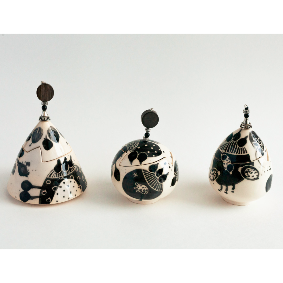 Bols, théières, assiettes, plats, boîtes, sculptures et luminaires.