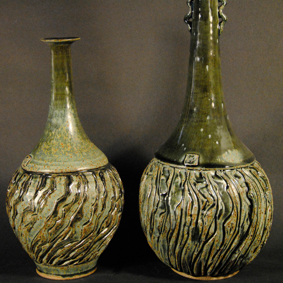 A l’âge de 10 ans, j’ai dit en voyant un potier tourner : “un jour, je ferai ça moi aussi”. Ce n’est que 25 ans plus tard que j’ai mis les mains dans la terre et depuis c’est une véritable passion. Passion pour les textures et la matière, pour les glaçures, et les cuissons. Je travaille sur deux axes : les pièces utilitaires et les pièces artistiques. Pour les pièces utilitaires je veux qu’elles soient fonctionnelles et belles. : de la beauté dans le quotidien. Ce sont toujours des pièces uniques ou de petites séries réalisées sans aucun moulage, au tour ou autres techniques. Mon travail est très proche de la philosophie japonaise. Pour qu’elles soient utilitaires, j’ai choisi d’utiliser les grès cuit à haute température dans un four à gaz/bois. Je réalise moi même mes glaçures et je les applique par coulage en les superposant, ce qui rend chaque pièce totalement unique car aucun décor n’est semblable. La cuisson finira le travail de personnalisation car au gaz et/ou au bois le résultat final est souvent une surprise ! Quant aux pièces artistiques, la plus part du temps, elles “tournent autour du pot” mais sont en fait des sculptures. Elles sont le fruit d’une vision. Le point commun est la recherche et la mise en valeur de contrastes de matières et de textures. Grace à la formation très complète et variée que j’ai reçu, je me sens libre de choisir la terre et la technique qui servira au mieux la réalisation de mon projet. Mon objectif : qu’on ne puisse se retenir de toucher et de caresser les pièces que je réalise, et surtout qu’on les utilise.